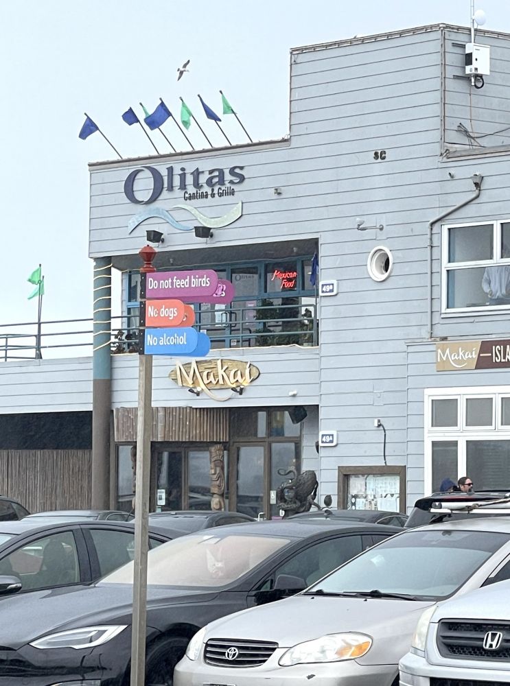 吃完早餐接上国内来的朋友去海边走走,午餐就在栈桥上的墨西哥餐馆。这家餐馆吃过很多次,喜欢它的原因是无敌的海景。从岸边到餐馆至少100多米,餐馆在2楼,窗外就是太平洋,天气好的时候很多玩帆船的从窗边经过,海鸥停在窗外的窗台上,非常特别的体验,可惜今天是阴天没有帆船,但有很多海狮在水里翻滚。