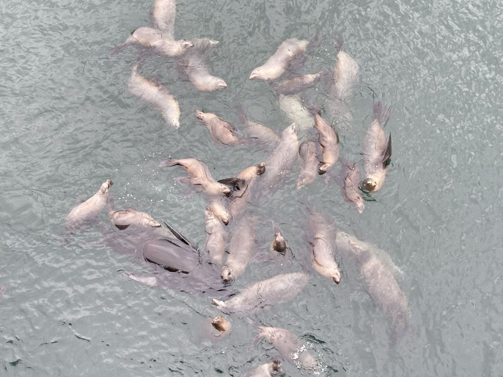 吃完午餐,看海狮,一大群一大群的海狮在海里睡午觉,小海狮睡午觉是侧睡的,一只超大海狮是蒙头大睡。海狮的叫声有点像羊叫。