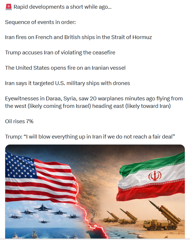 几分钟前,叙利亚德拉的目击者看到 20 架战机从西部起飞(可能来自以色列)向东飞行(可能飞往伊朗)