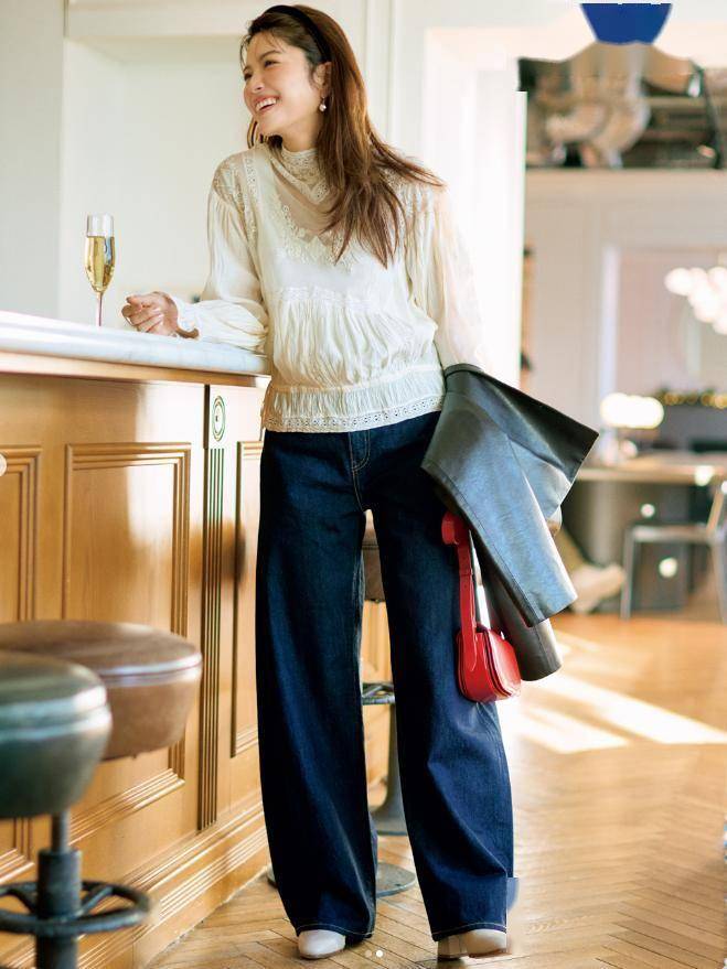 单穿牛仔也能打造层次,牛仔衬衫叠穿针织衫,软硬面料碰撞,增添智性氛围。