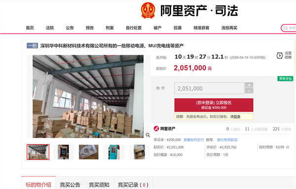 阿里资产司法拍卖平台显示,深圳华中科新材料技术有限公司名下的一批充电宝、充电线等资产,将于4月19日开拍,起拍价205.1万元。
