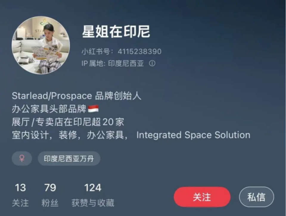 凤凰网财经《公司研究院》发现,小红书上一个名为“星姐在印尼”的账号,自称是 Starlead/Prospace品牌创始人,频繁分享公司办公家具产品,账号主体疑似为何星。