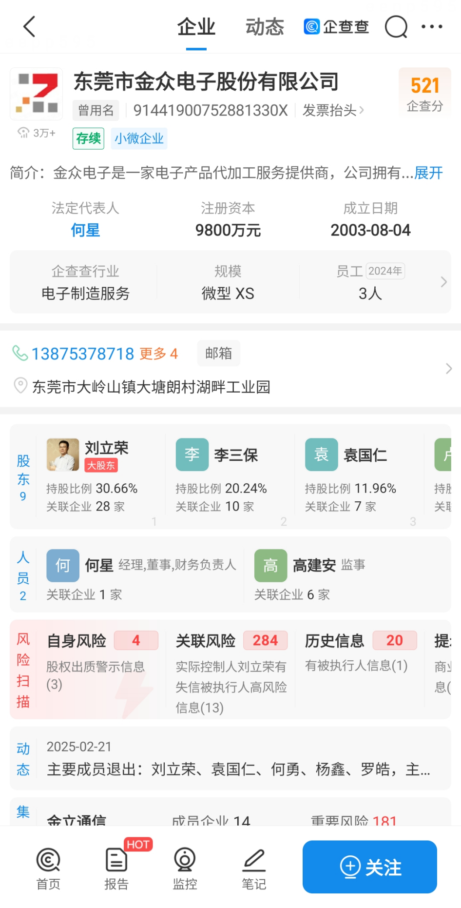 企查查信息显示,2025年2月,金立集团旗下的东莞市金众电子股份有限公司曾发生高管变更,何星出任该公司法定代表人、董事、财务负责人及经理;刘立荣虽退出高管行列,却仍以 30.66% 的持股比例,成为第一大股东。