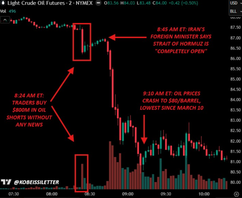 到9点10分,美国WTI原油期货一度跌穿80美元/桶关口。The Kobeissi Letter估算称,这意味着这笔交易在不到一个小时里获利7000万美元。考虑到整体事态在周五傍晚就出现反转,所以具体的盈利情况取决于这些空单是否已经快速了结。