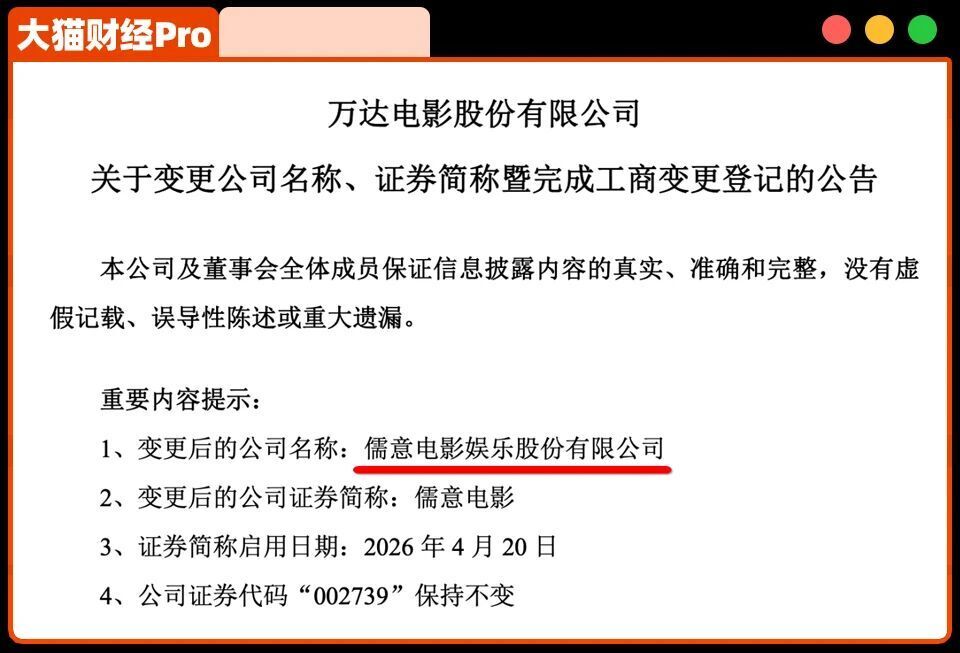 4月20日开市,万达电影正式更名为儒意电影,但是万达影城的名字暂时不变,“未来会根据市场变化和用户需求规划新品牌”。