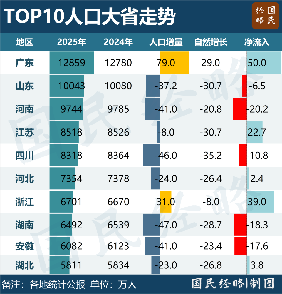 TOP10人口大省中,只有广东、浙江正增长,中部人口重镇湖南、安徽、湖北全线陷入负增长区间。