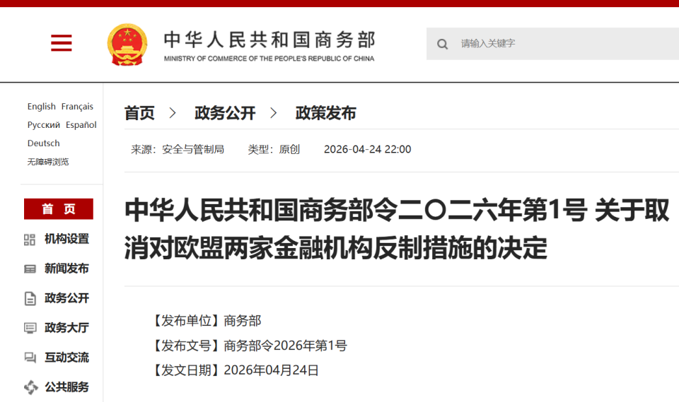 4月24日,商务部发布《商务部令2026年第1号》,根据《中华人民共和国反外国制裁法》《实施〈中华人民共和国反外国制裁法〉的规定》等法律法规,鉴于2026年4月23日欧盟宣布撤销对中国两家金融机构的制裁,中方决定自北京时间2026年4月24日起,取消商务部令二〇二五年第5号对欧盟UAB Urbo Bankas和AB Mano Bankas两家银行的相关反制措施,并将其移出反制清单。