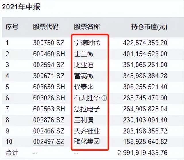以信澳新能源产业为例,2021年年中,其十大重仓股大部分为新能源概念股,包括宁德时代、比亚迪、璞泰来、石大胜华、雅化集团等。