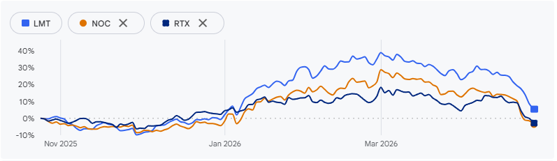 然而,进入实战阶段后,前两家公司股价已从高位回落约10%,Lockheed Martin跌幅亦达5%左右。
