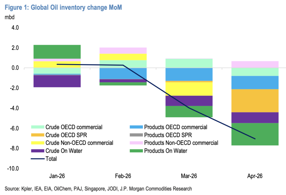 据摩根大通估算,全球石油库存正在迅速下降,3月减少约400万桶/日,4月进一步扩大至710万桶/日。