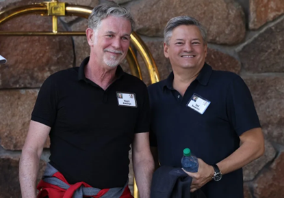 Netflix联合创始人及前首席执行官里德·黑斯廷斯(左)与继任者、联席首席执行官特德·萨兰多斯。图片来源:Kevin Dietsch—Getty Images
