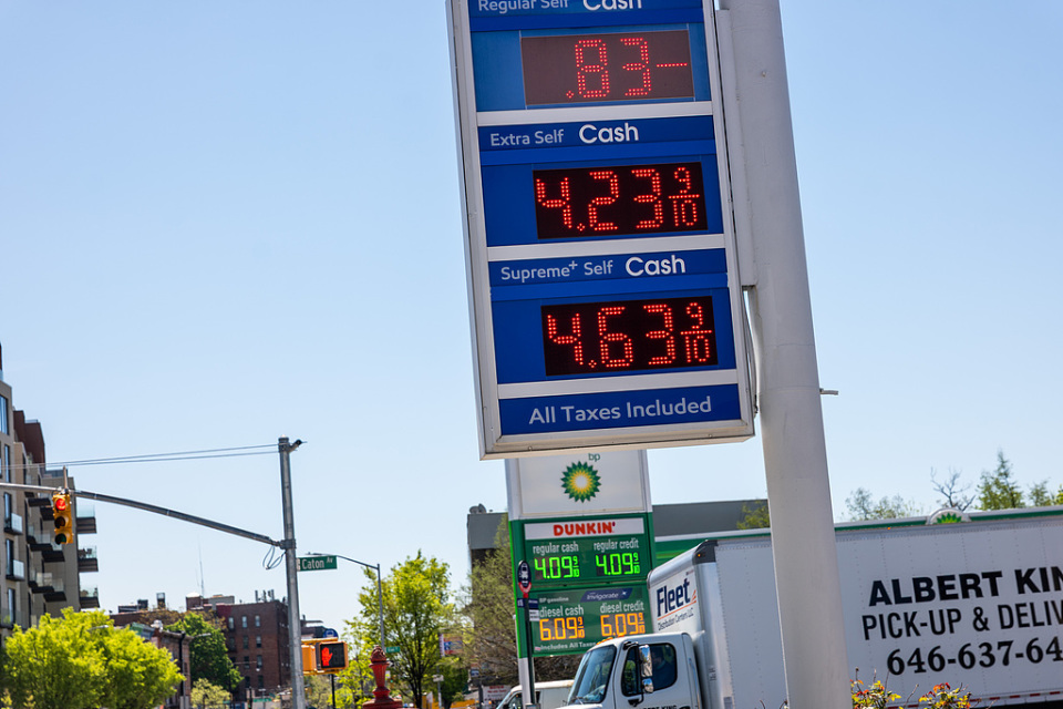 21日,美国纽约布鲁克林一加油站显示油价仍处于高位。(视觉中国)