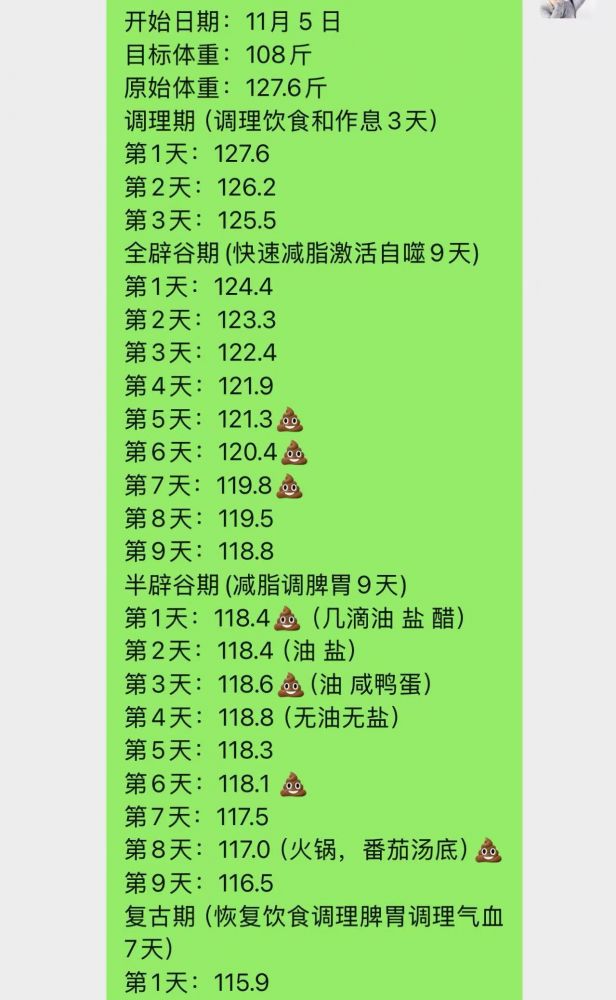我回来啦!先说结果,再报过程:D 结果:半辟谷9天旅程结束,体重继续下降2.5斤=2.8磅。前4天有些混乱,后4天科学调整后每天以0.5-0.6磅的速度平稳下降,燃脂代谢被完全激活,进入黄金代谢期,不做任何运动也会掉秤。皮肤由内向外的散发光彩。身体没有出现任何不适。没有饥饿感,也没有疲乏感。 过程:过程有些曲折,值得好好书写:D 这是我的每日打卡记录 [阅读全文]
