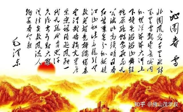江山如此多娇,引无数英雄竞折腰。惜秦皇汉武,略输文采;唐宗宋祖,稍逊风骚。一代天骄,成吉思汗,只识弯弓射大雕。俱往矣,数风流人物,还看今朝。