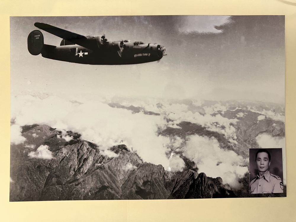 悲壮驼峰航线,Ubangi Bag 号飞越越喜玛拉雅山/The Hump, 照片取自网路:http://dainthecbi.com/images/Martin/308-UBANGIBAGII.jpg , ( 右下角邝廷着盟军服. )