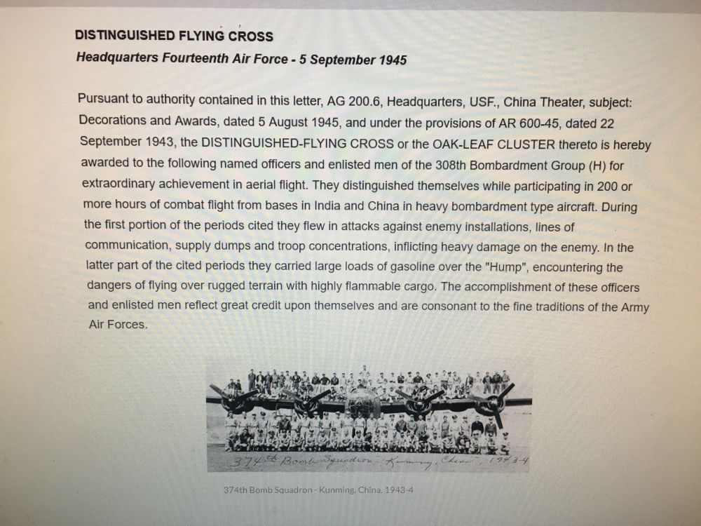 美国飞行十字勋章颁发:十四航空队总部1945年9 月5 日公告:下列受颁者为飞越喜马拉雅山(the Hump),执行运输及轰炸任务超过200小时以上。邝廷第二排左七(308 大队/374 分队于昆明), 新闻及照片取自网路/https://bobscaping.com/cbi/)