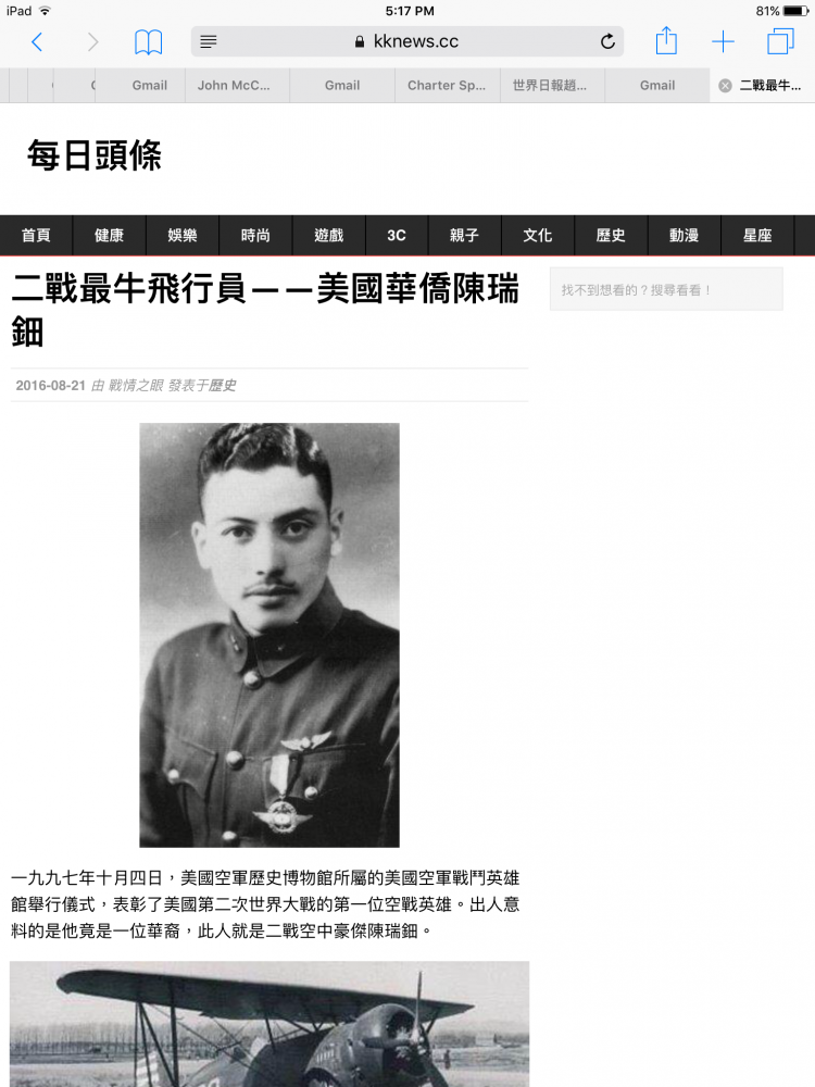由于此书燃起了家人对华裔参军史及在华飞虎队的兴趣;我们在网路上阅读了200余篇中英史料,也读到了前所未知的美国华侨飞行报国的各种事迹。惊讶的是,美军助华之前的抗日战争中,飞在中国天上的飞机,近四分之三的飞行员都是来自美国的华裔子弟。当时这一群曾在中国引人侧目的美侨军人,第一批回国约300多人、加入中国空军抗日,阵亡170余人。这些人在美国都有飞行执照或者自己拥有轻型小飞机,大多来自富裕的美国华裔家庭,是一批完全没有义务回国浴血牺牲的飞行员 ; 回到中国前,我的父亲在他的家乡爱达荷州拥有美国飞行员执照,一架轻型飞机和一辆雪佛兰轿车。我们在书中读到在中国的各种战役,幸运的他 能保住了宝贵的生命。当他退伍后,他也很满足于有一辆旧自行车相伴的日子。