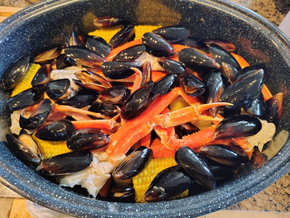 再放蟹腿和 mussel, 蟹腿先冲洗一下,mussel 先放洗菜盆里稍微用水过一下去掉壳的碎屑,不要太多水,过完的水沉淀一下等会儿再浇上去,因为有调料的,不要浪费了