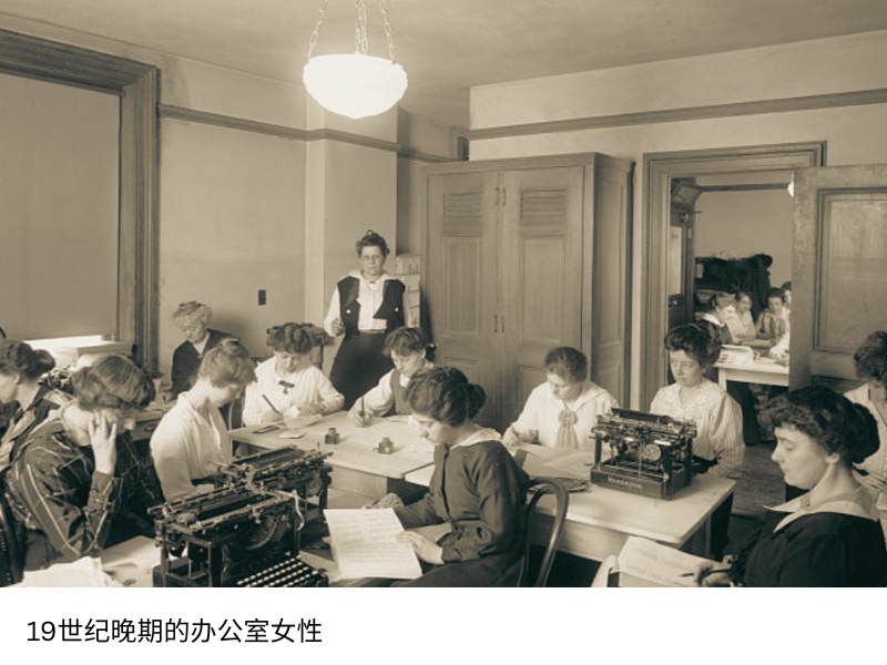 到1900年,美国办公室的打字员中,女性占比已经达到四分之三。这并非女性主动争取而来,只是社会用工出现缺口,时代选择让女性承接了这份工作。