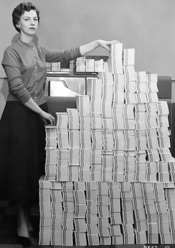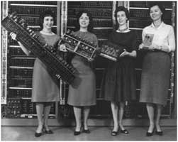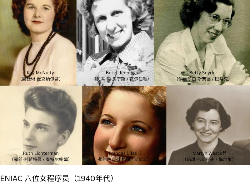 1946年,世界第一台通用电子计算机ENIAC诞生。六位女性负责操作这台庞然大物,她们分别是:凯瑟琳·安东内利、让·巴蒂克、贝蒂·霍尔伯顿、弗朗西斯·斯宾塞、马琳·梅尔策、露丝·泰特尔鲍姆。她们负责调试线路、编排逻辑,并编写核心程序。她们的贡献并未得到重视,甚至在报纸刊登的计算机照片里也没有署名,人们一度以为她们是模特,直到多年后才重新被看见。