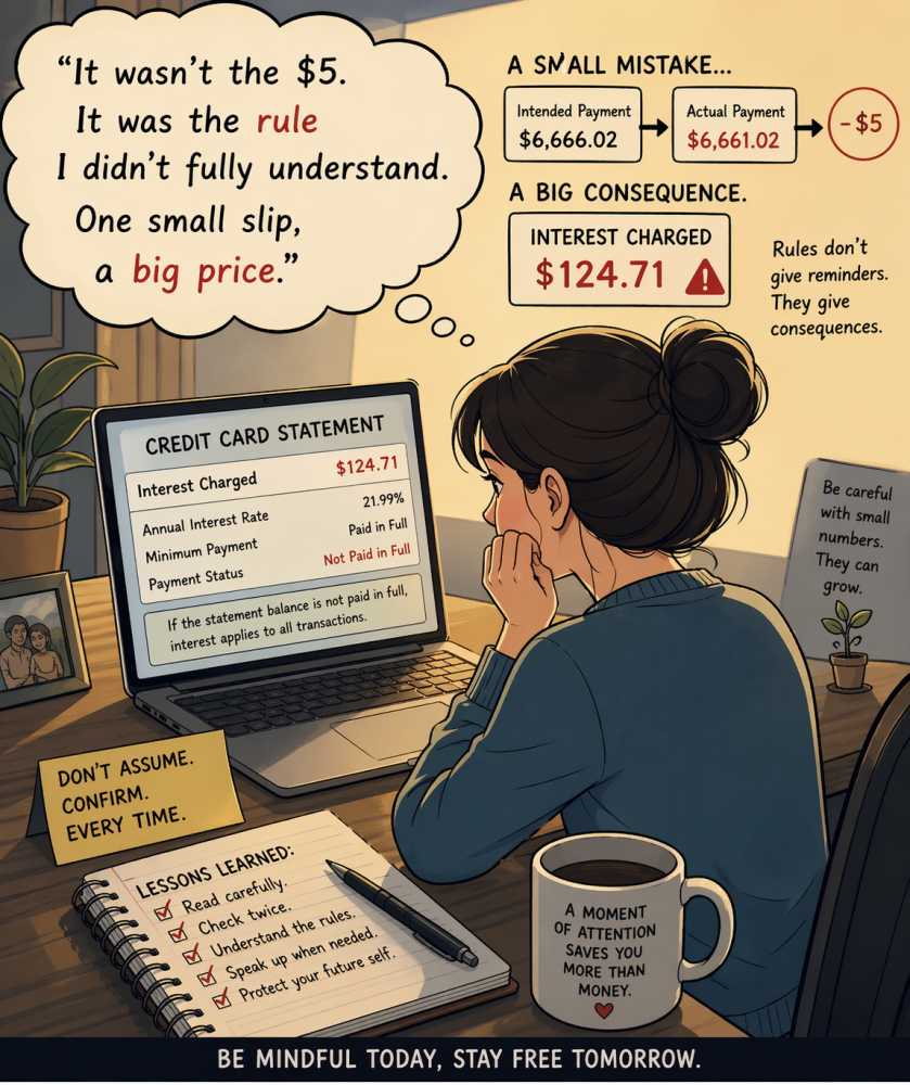 “Sorry… just to confirm, you mean I missed five dollars, and the interest is $124.71?”