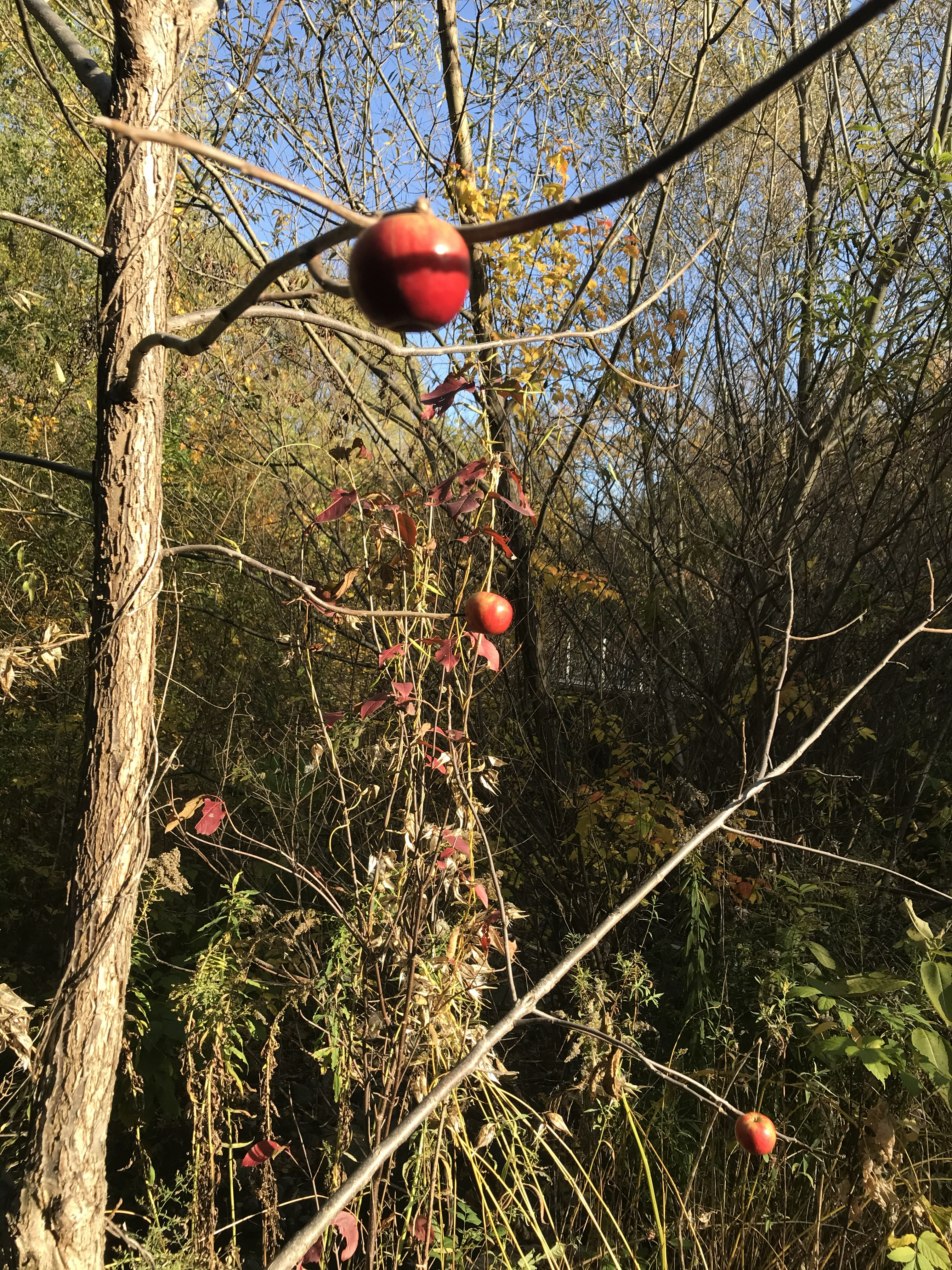 3 trail边上的树不是苹果树,上面怎么会有了苹果?细看不知是谁插在树枝上