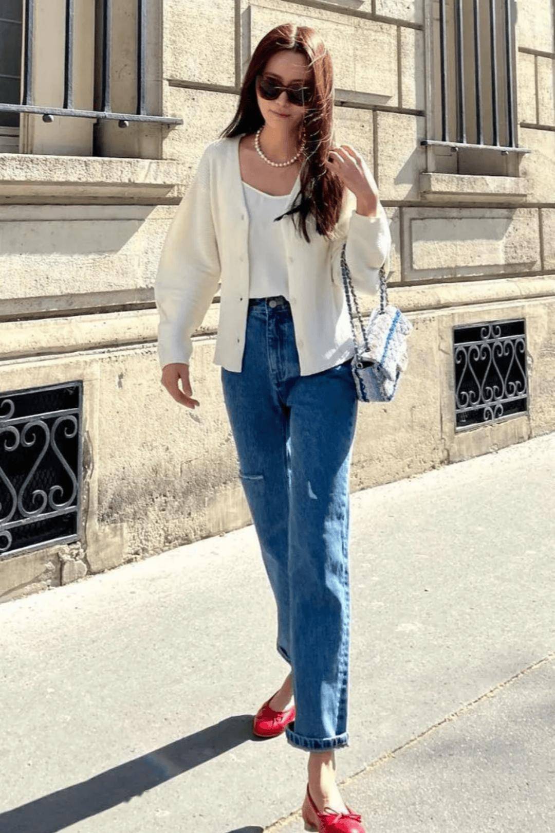中性雅痞的牛仔裤能够和细腻温柔的针织奶奶衫达成互补,一刚一柔相中和,助你尽展多面魅力。