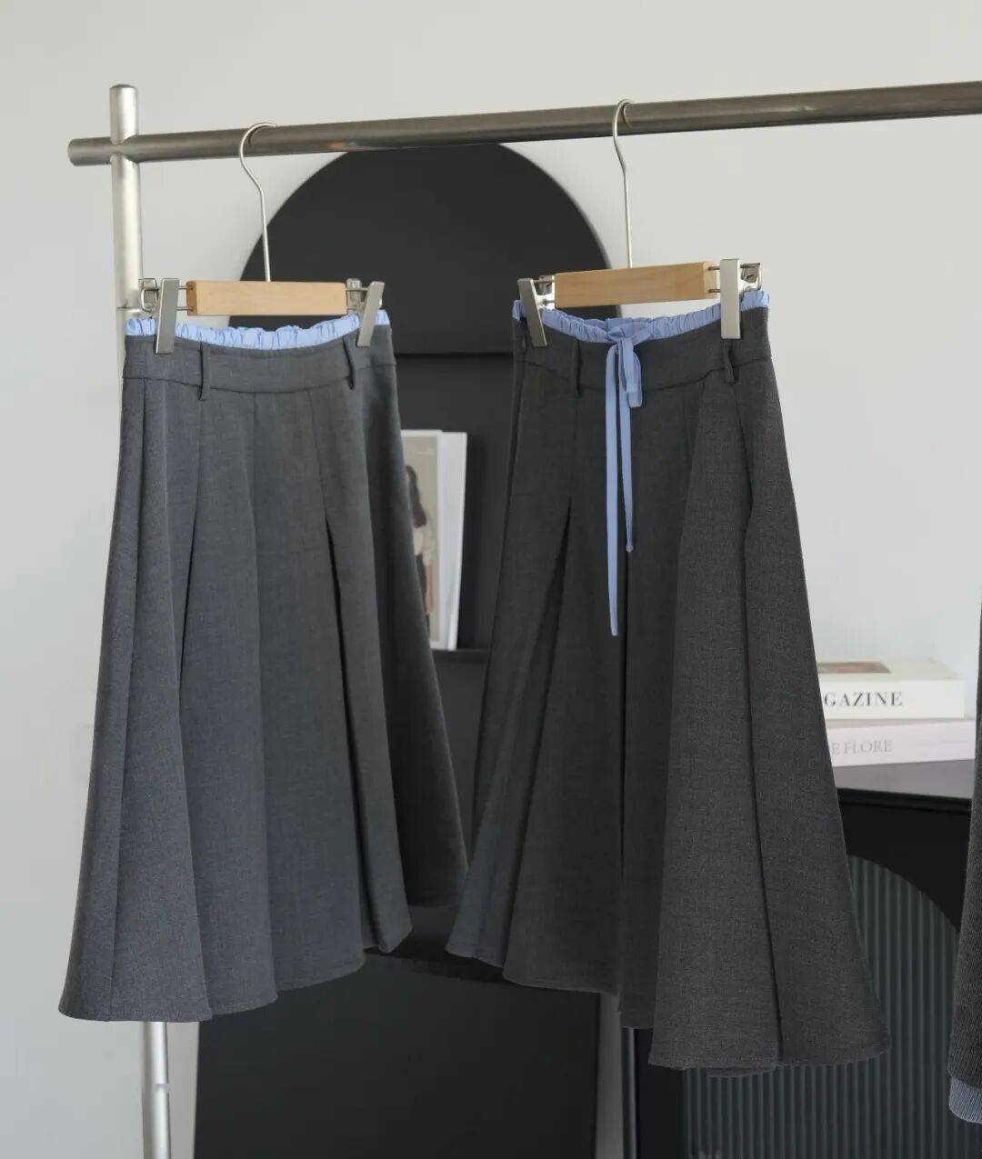 在搭配上,建议搭配:蓝色系带灰色百褶裙。灰色的沉稳平衡了粉色的跳跃,那一抹蓝色系带更是灵动,整套穿去约会赢麻了!