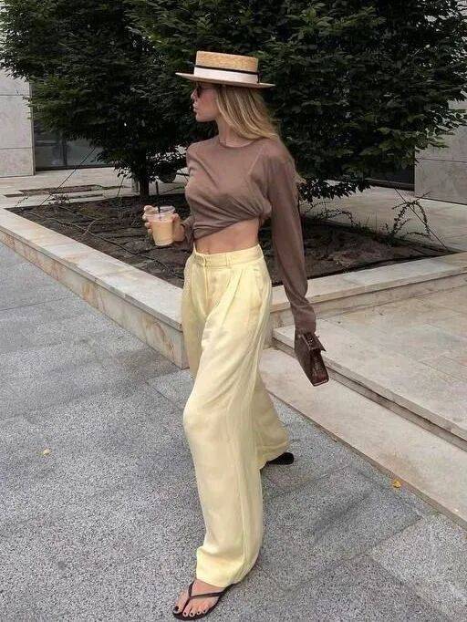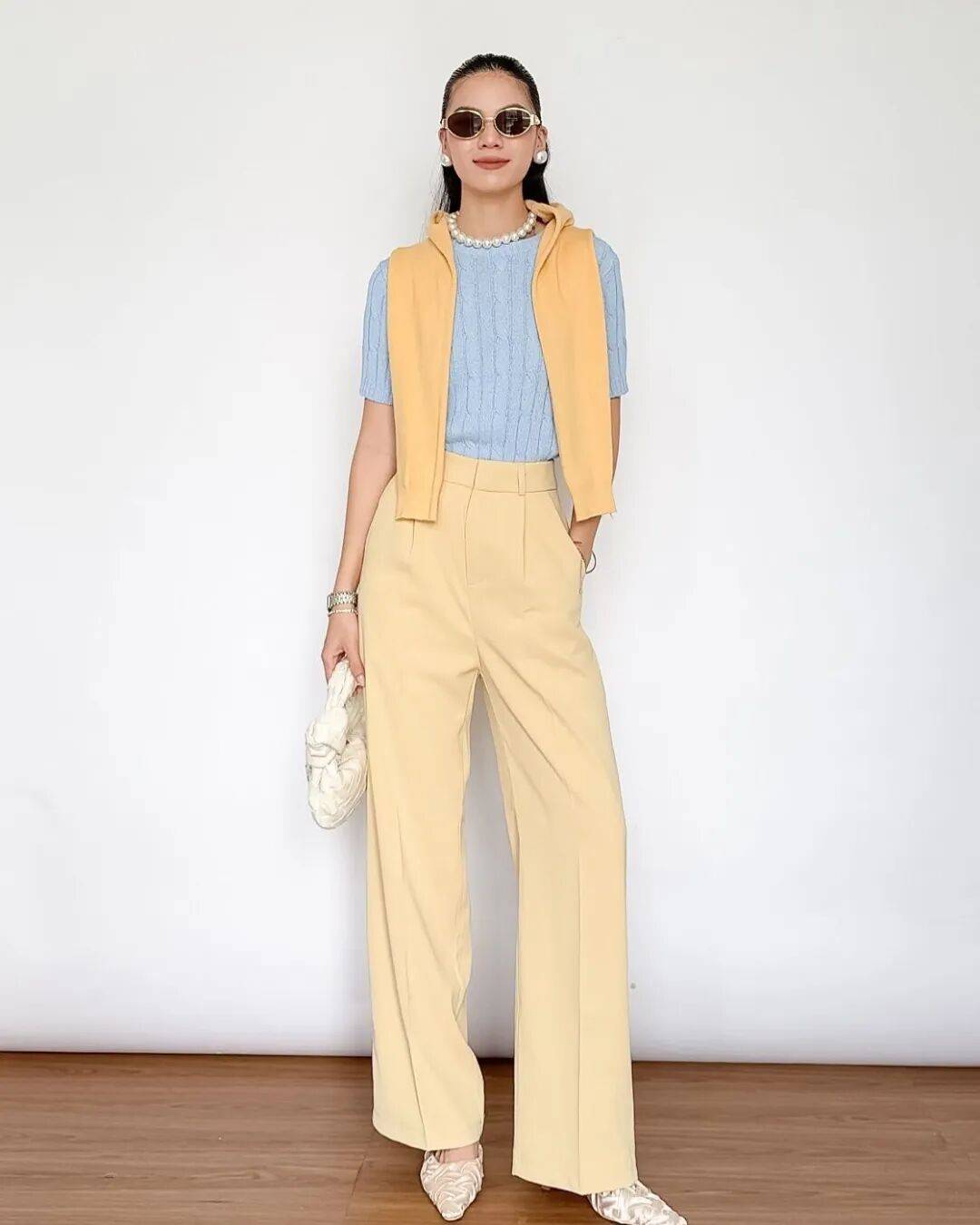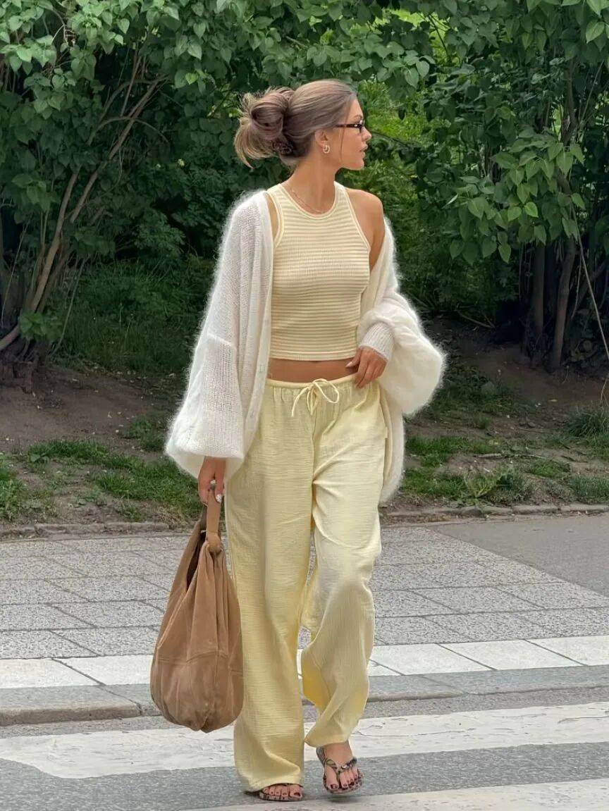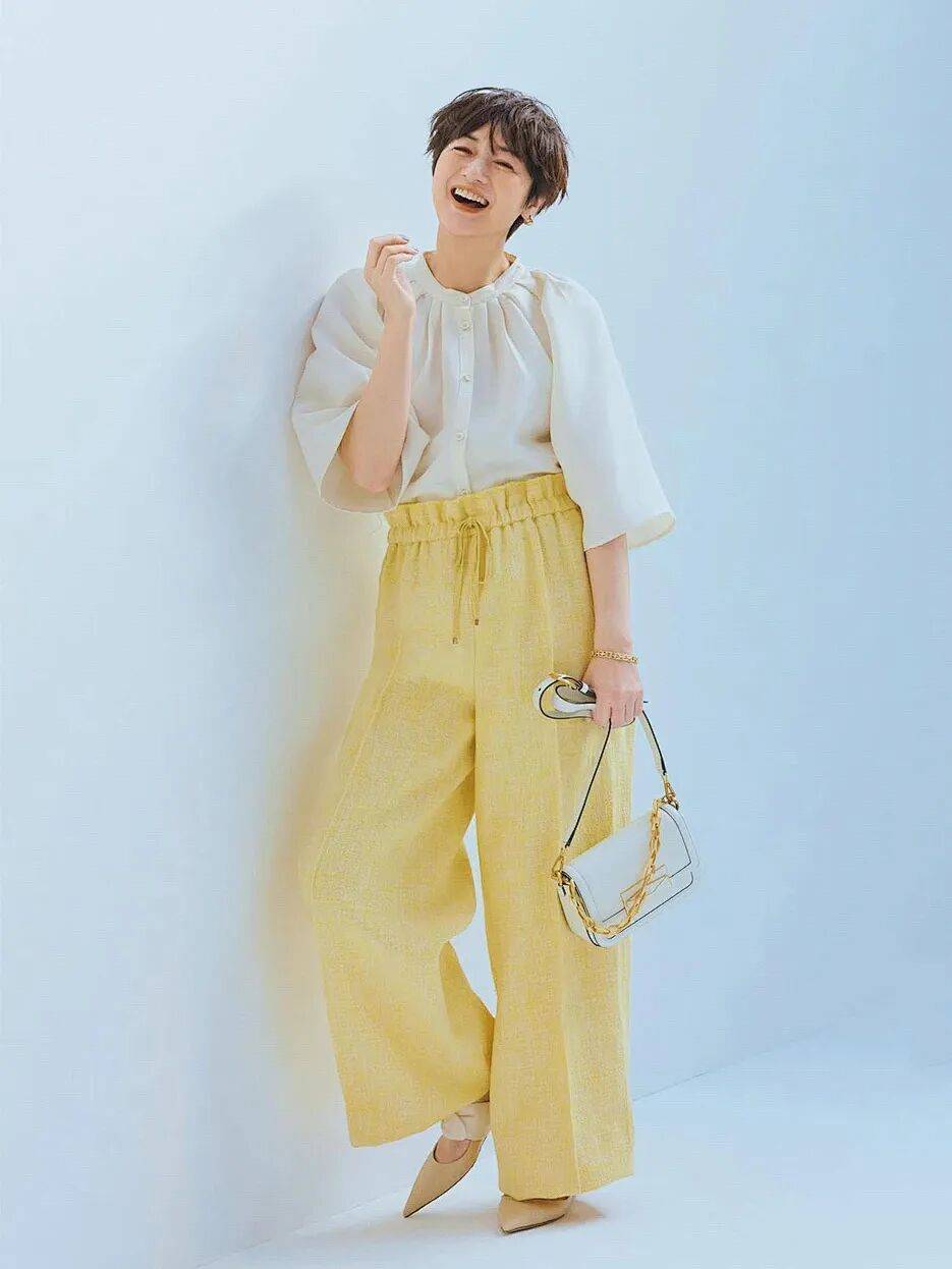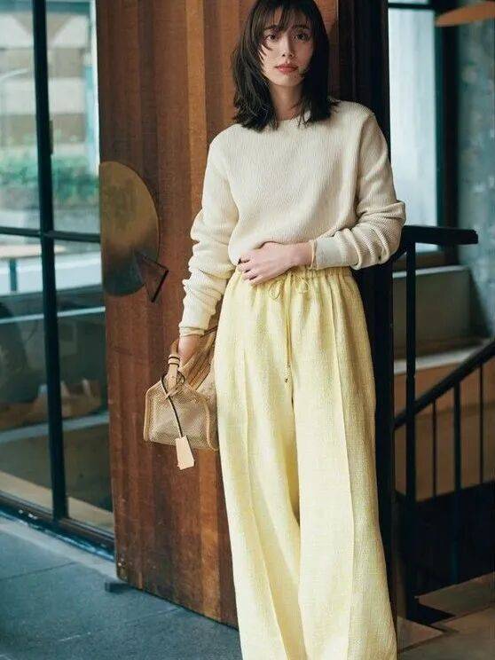 有搭配力的时髦精,可以把香草黄阔腿裤穿得很有层次亮点,哪怕只是看似轻松随意的基础品,都能感受到一抹慵懒、度假的氛围。