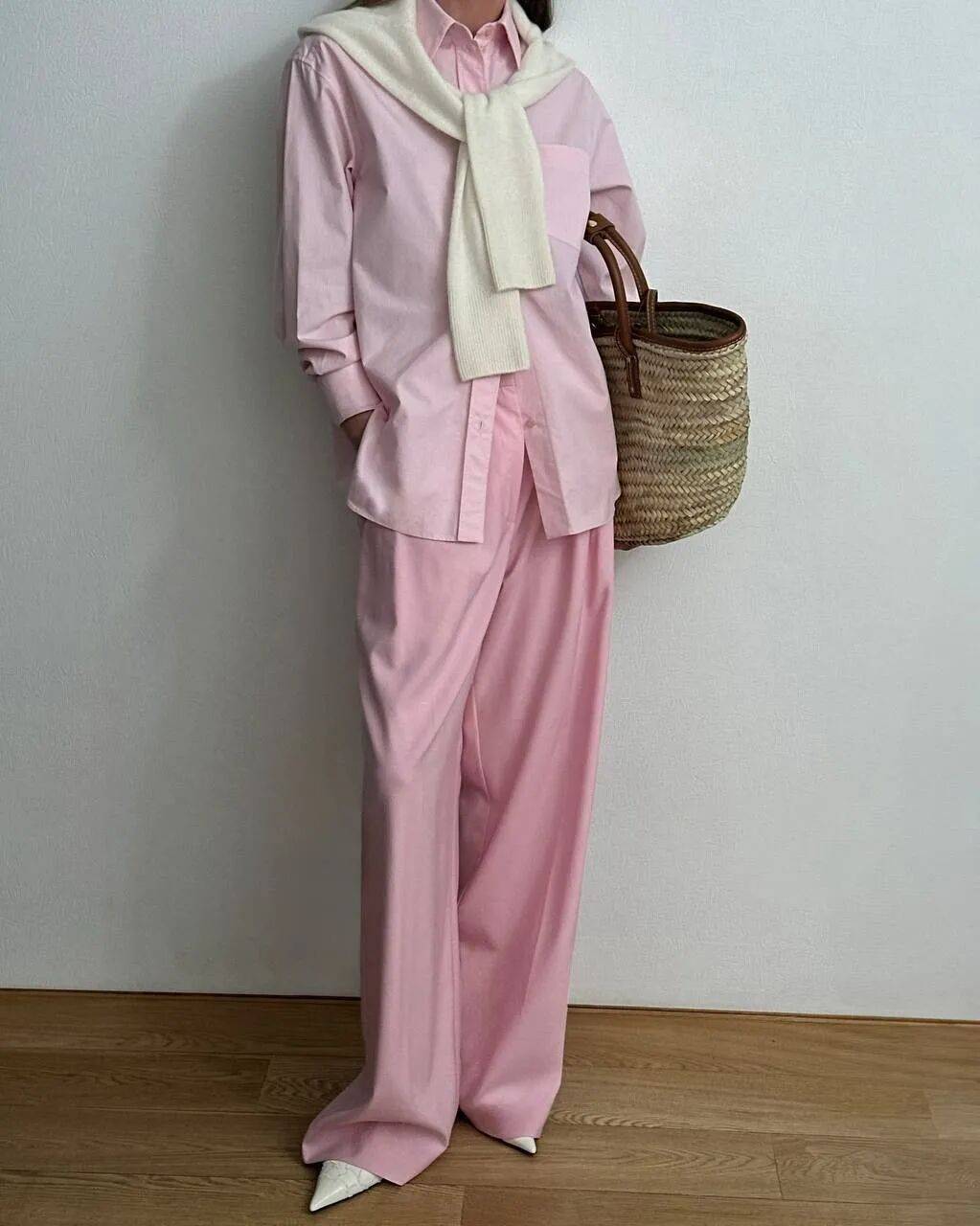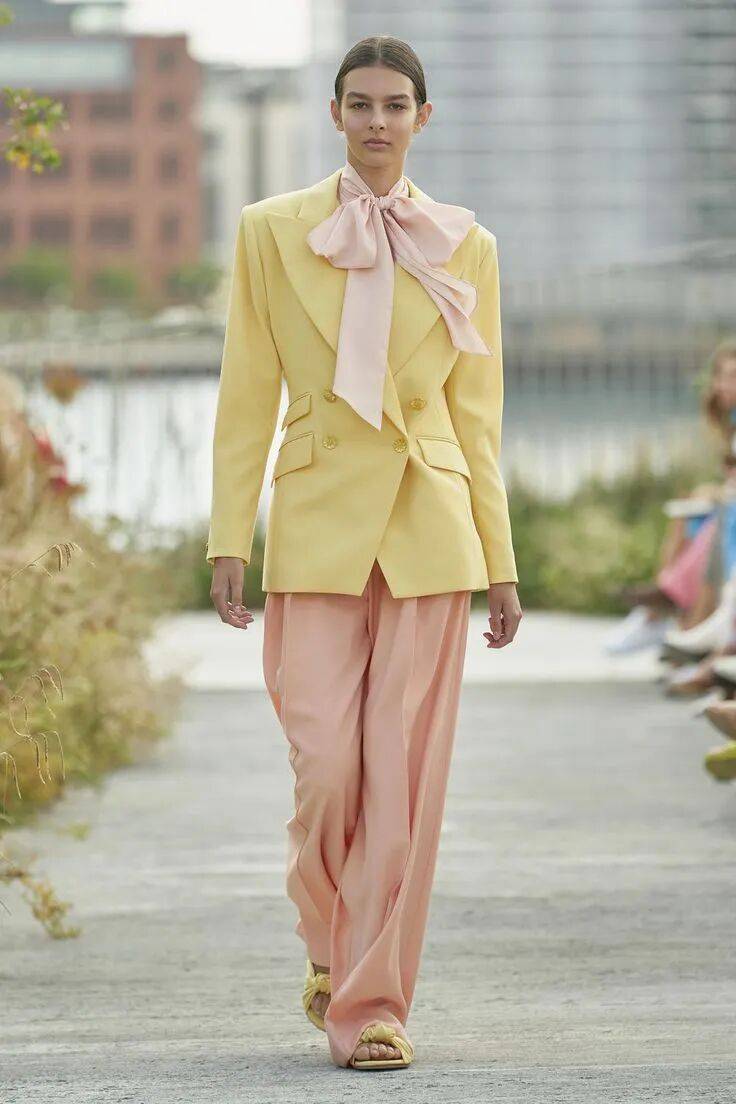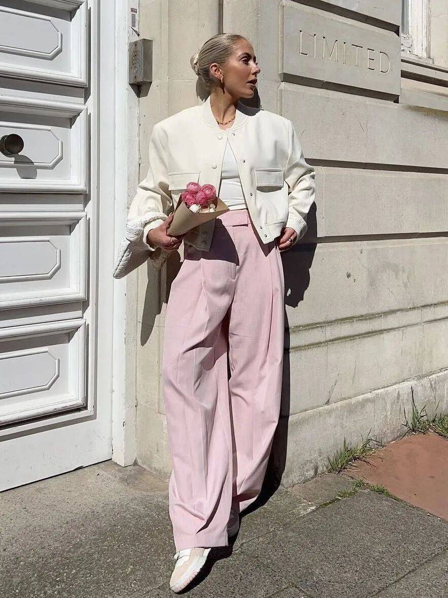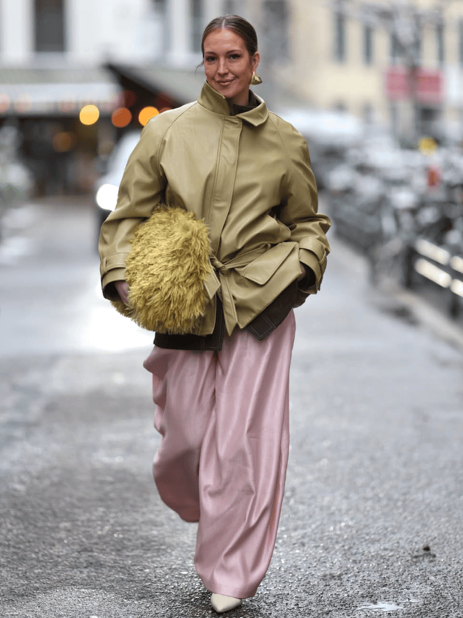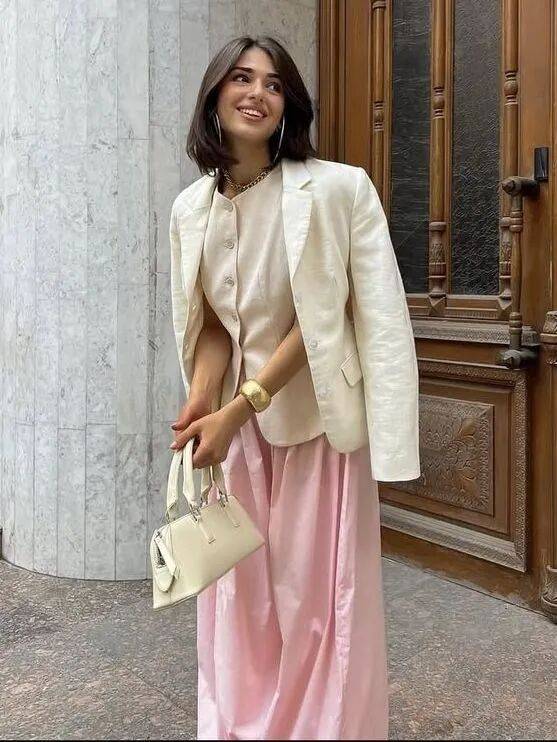 而低饱和的小鸡黄外套+柔雾粉阔腿裤,不是那种浓烈的撞色,彼此渗透、互相映衬,明媚但不刺眼,甜美但不幼稚。