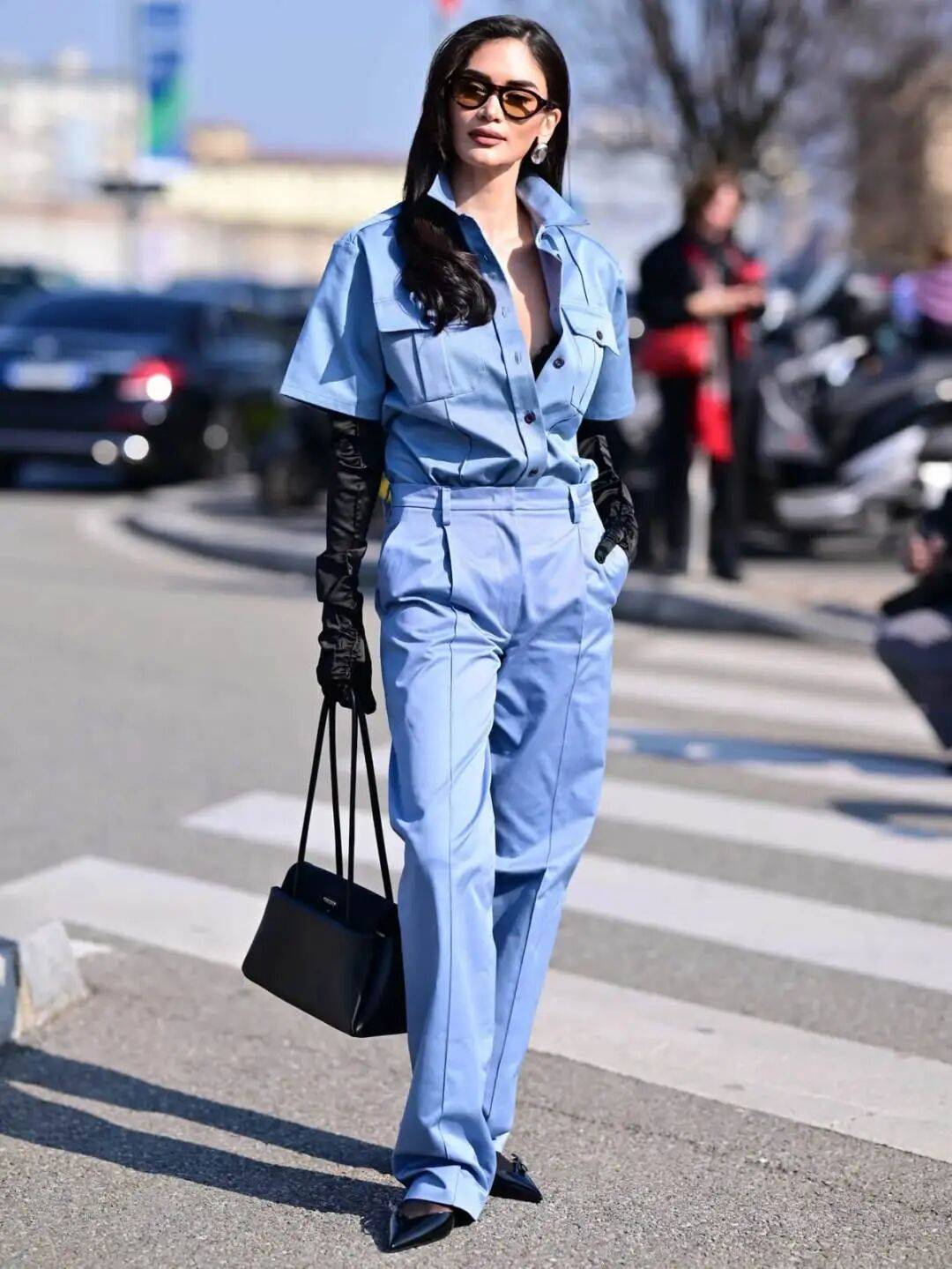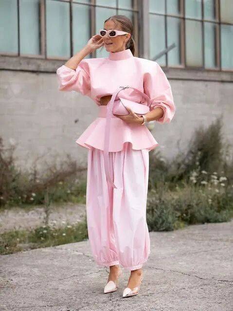 所以,当你决定pick同色系的搭配时,不妨试试有轮廓空气感或垂坠面料的阔腿裤(泡泡裤甜美、拖地阔腿裤显气场),时髦得毫不费力。