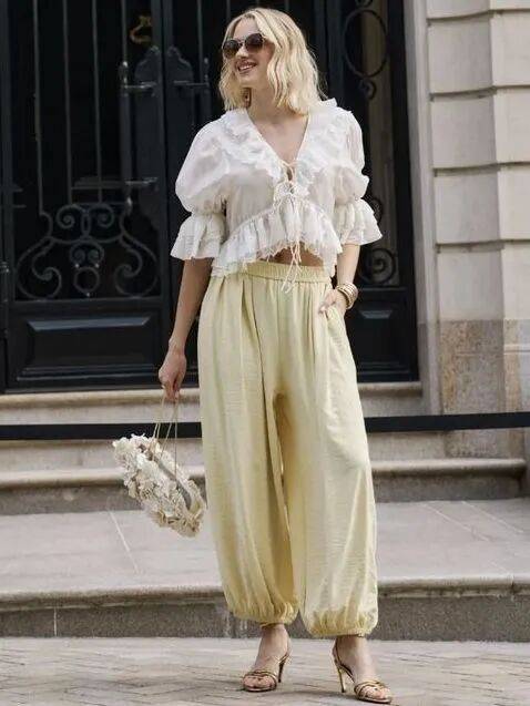 香草奶油黄阔腿裤不像纯白色那般小心翼翼,饱和度也非常柔和百搭,搭配白色泡泡袖衬衫,在自然光的折射下,显得愈发明媚动人。