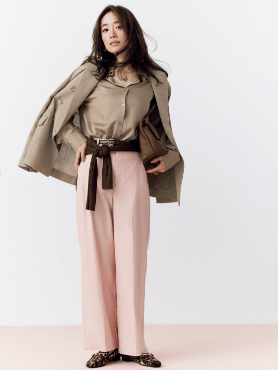 深色系是柔雾粉阔腿裤的舒适区。