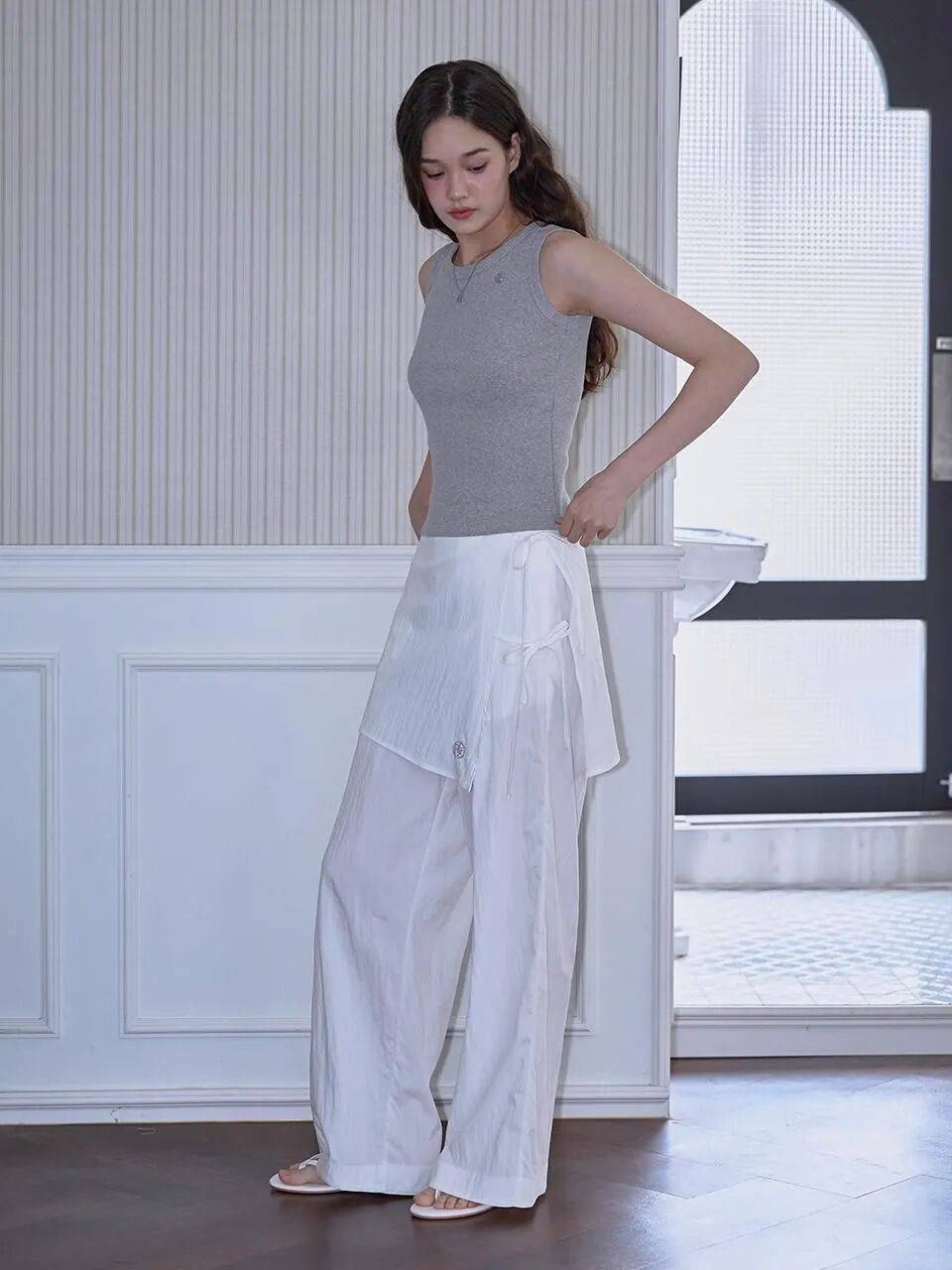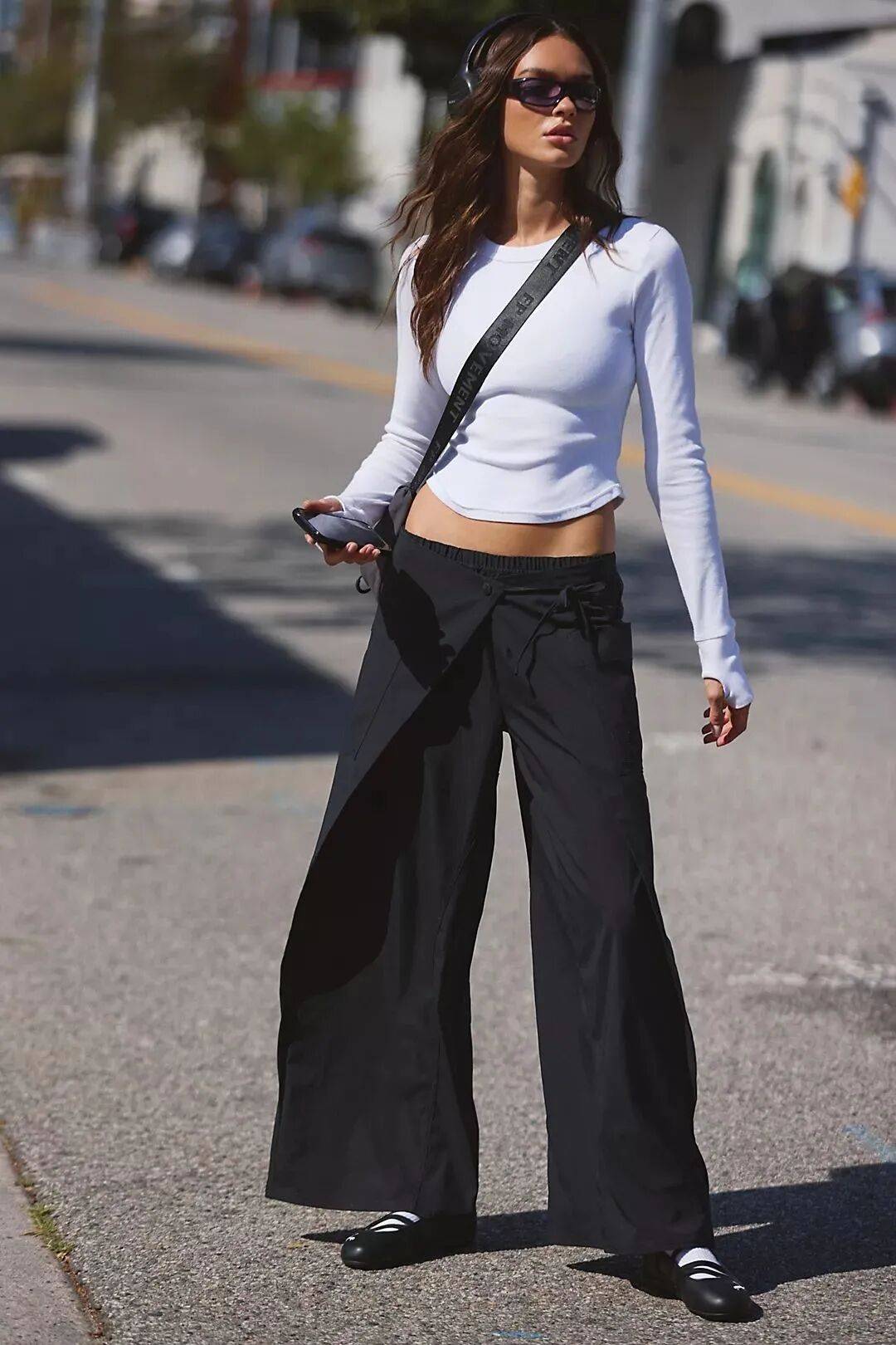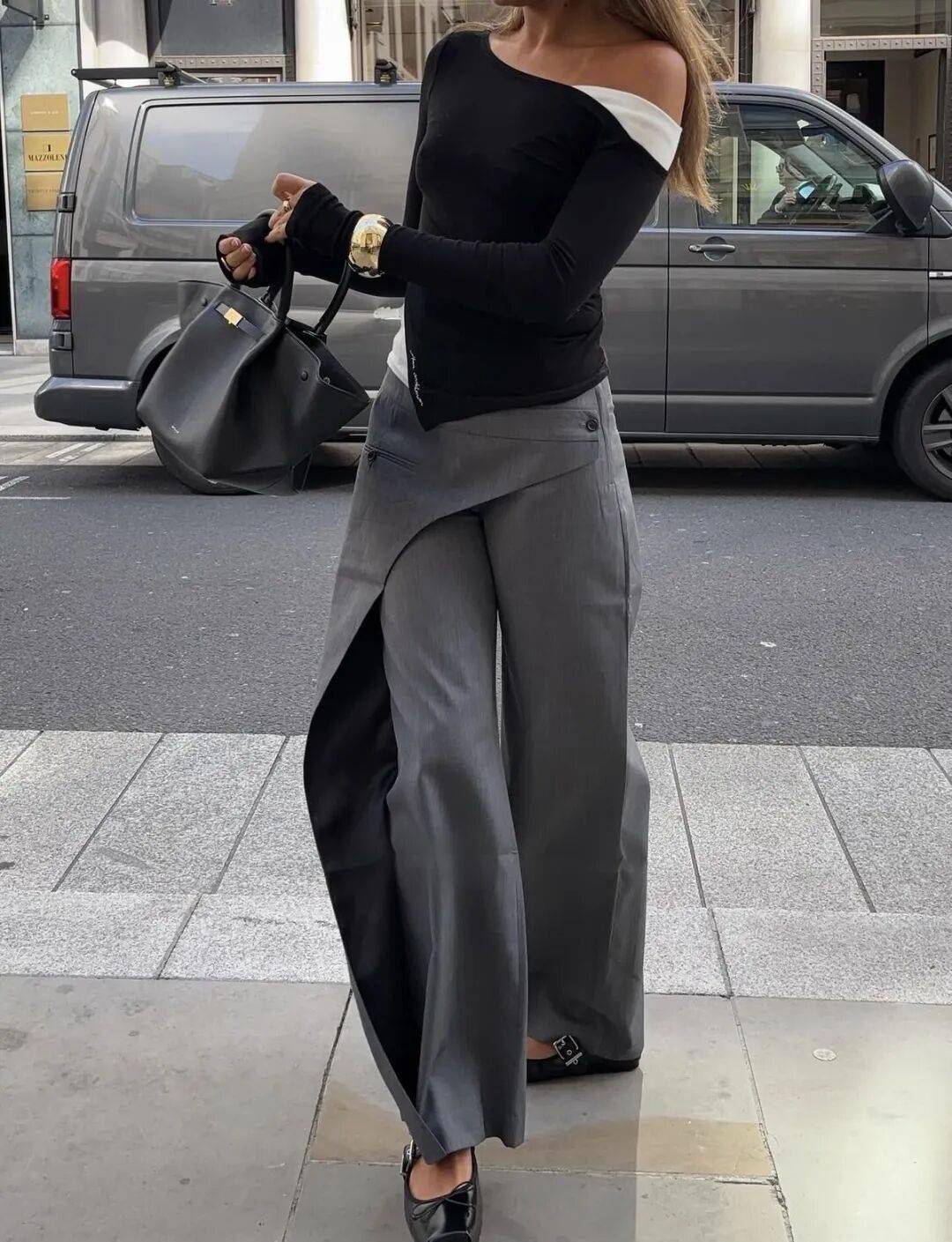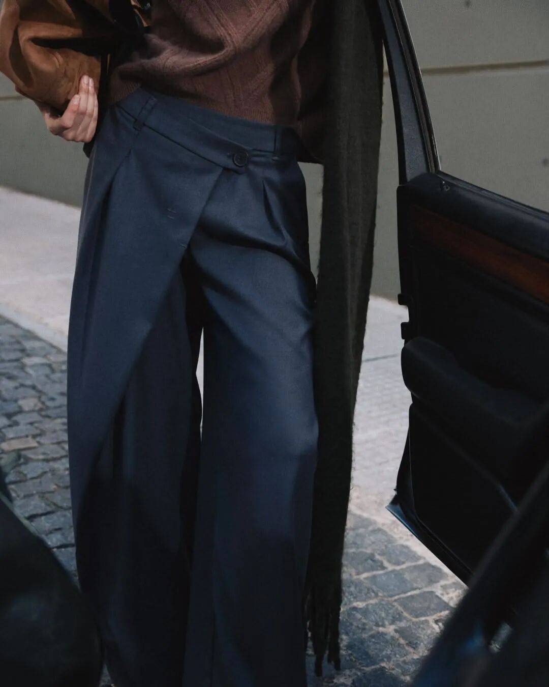 这种裤型的最大特色,在于交叠包覆的剪裁——腰头的布料会从单侧或双侧环绕双腿,让整体轮廓介于裙装与裤装之间,在流动感与结构感之间取得微妙平衡。
