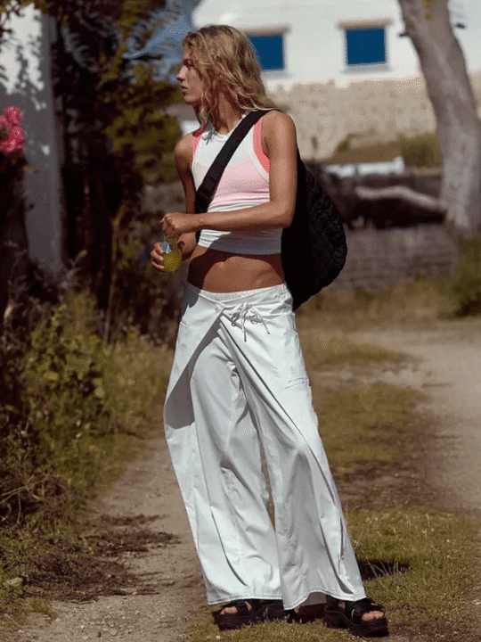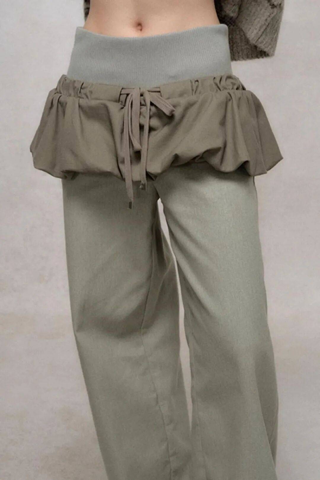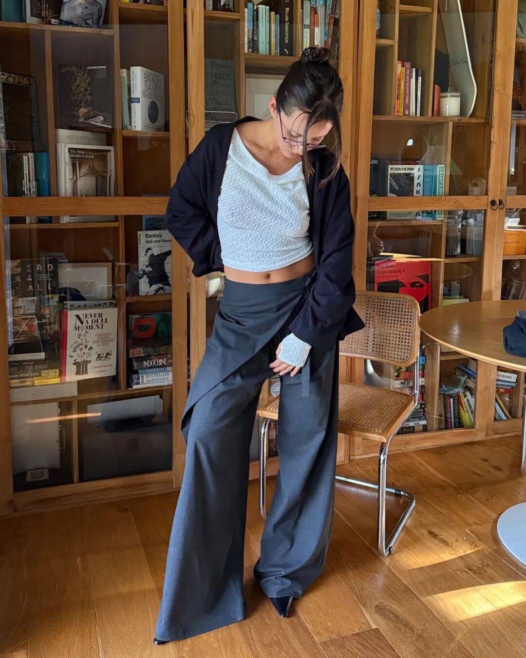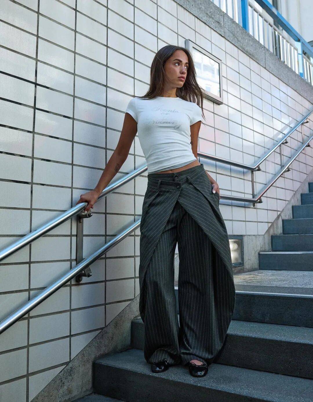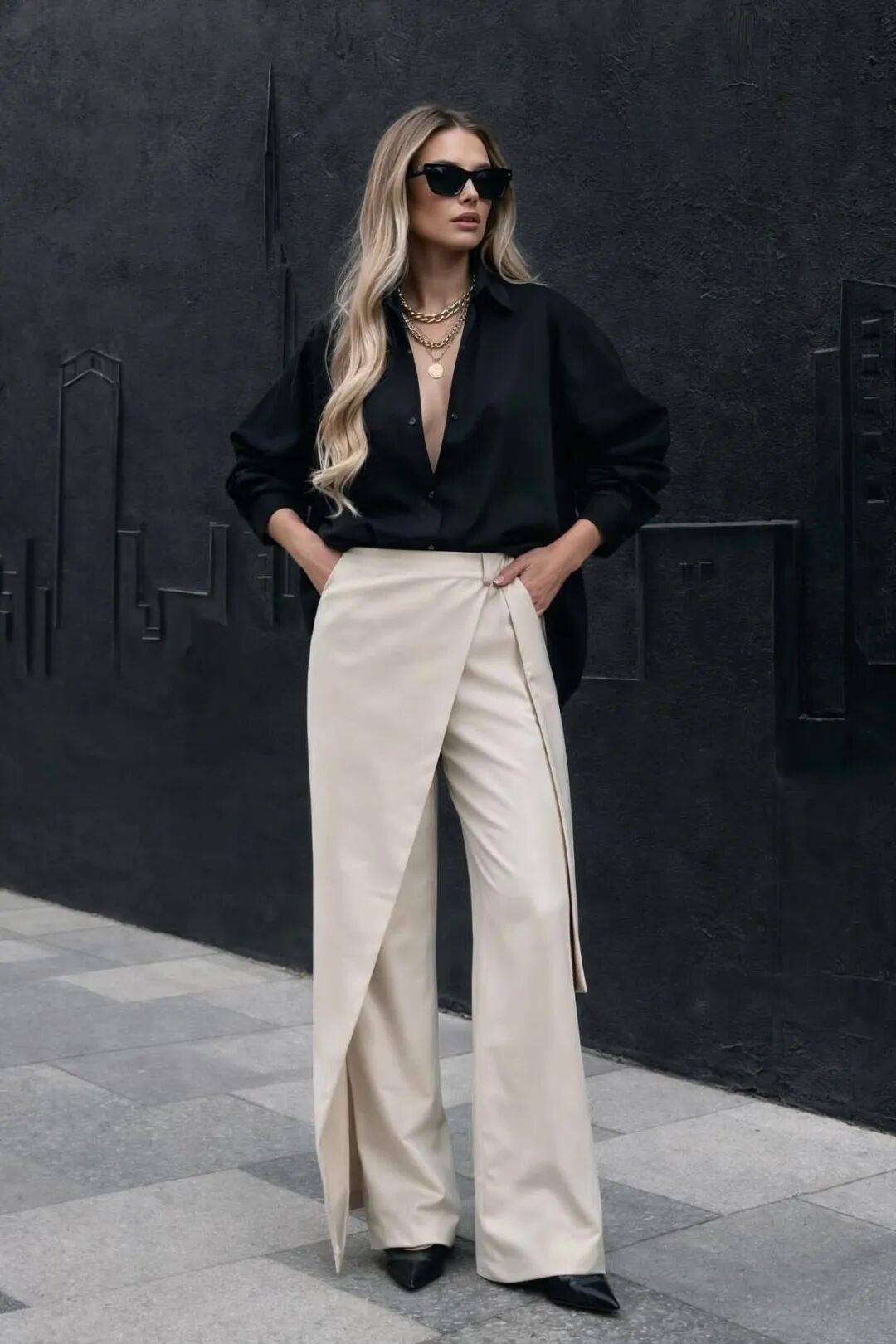 这种裤型的最大特色,在于交叠包覆的剪裁——腰头的布料会从单侧或双侧环绕双腿,让整体轮廓介于裙装与裤装之间,在流动感与结构感之间取得微妙平衡。