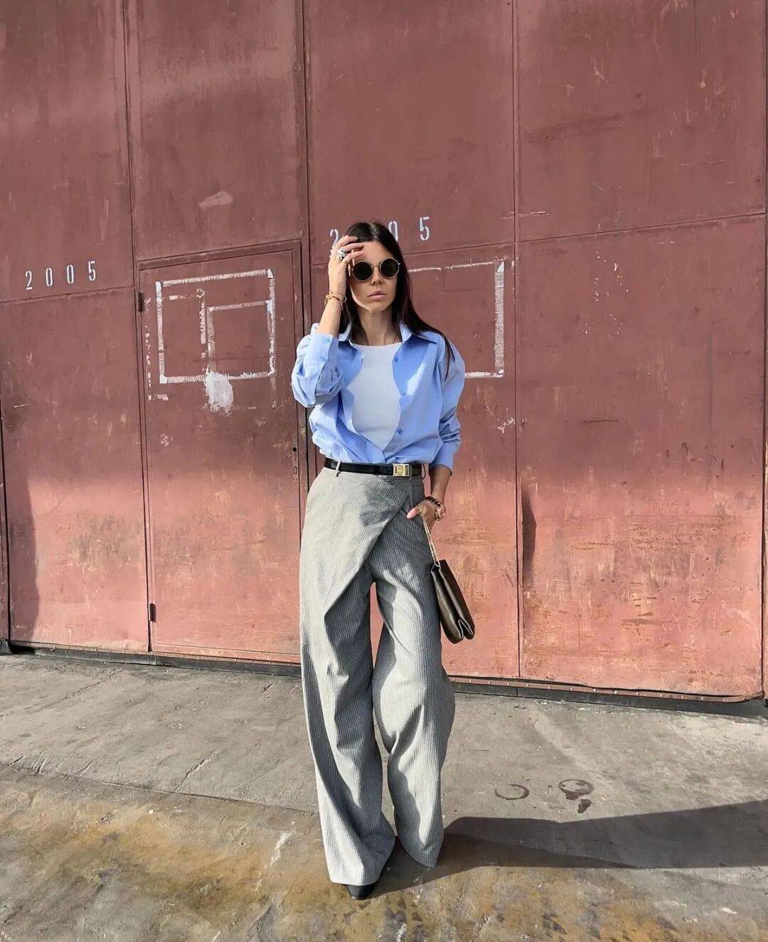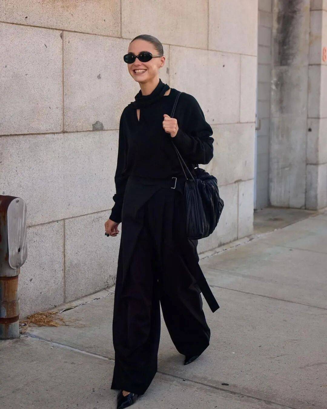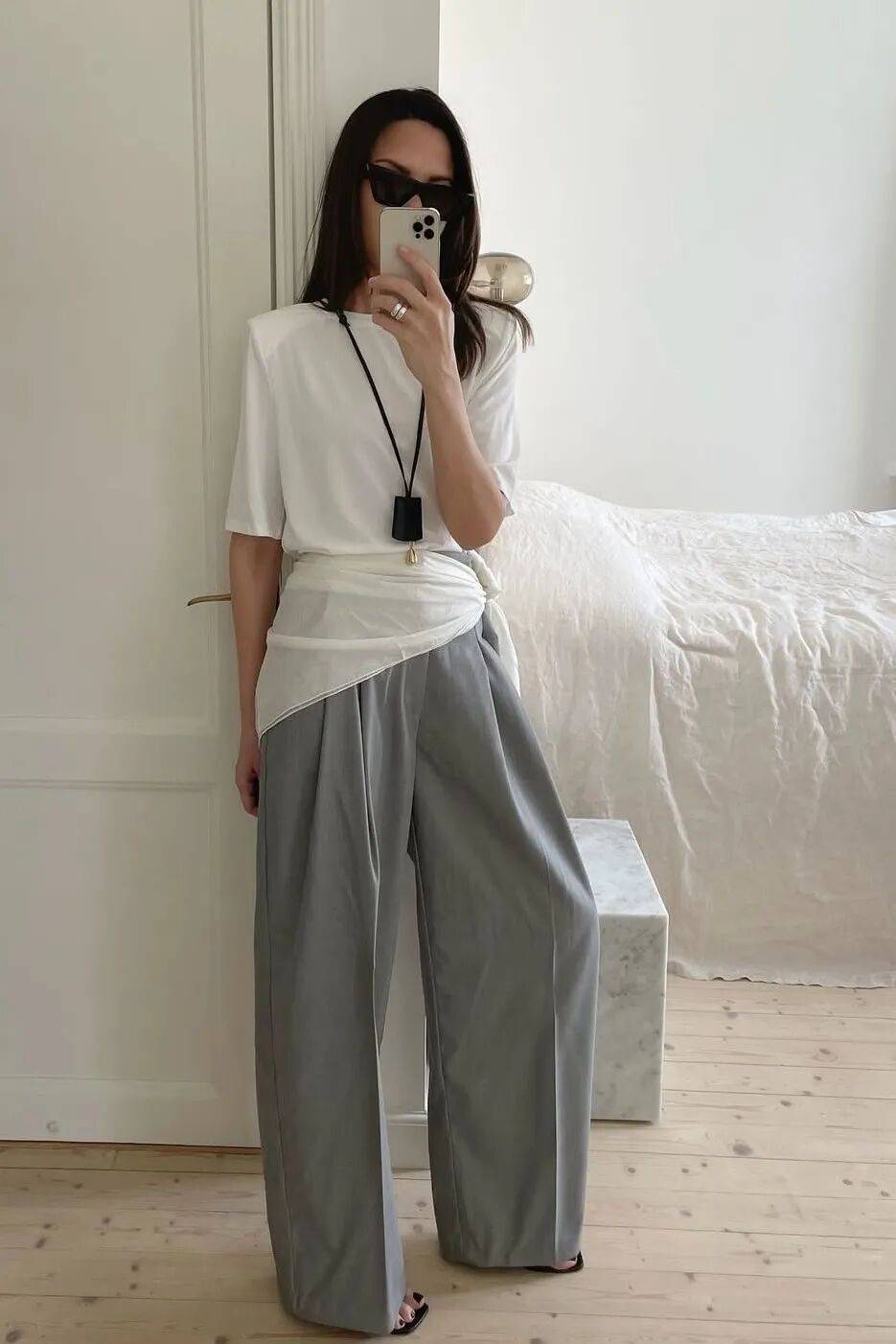 也不是非得买新裤子才能跟上这股流,用手边喜欢的裤子搭配丝巾或裙子,也能轻松打造wrap trousers的造型。