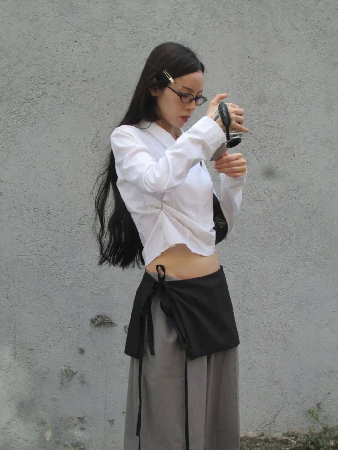 直接把一片裙穿在裤子外面,裙片打开到一侧,同样能模拟出围裹的层次感。