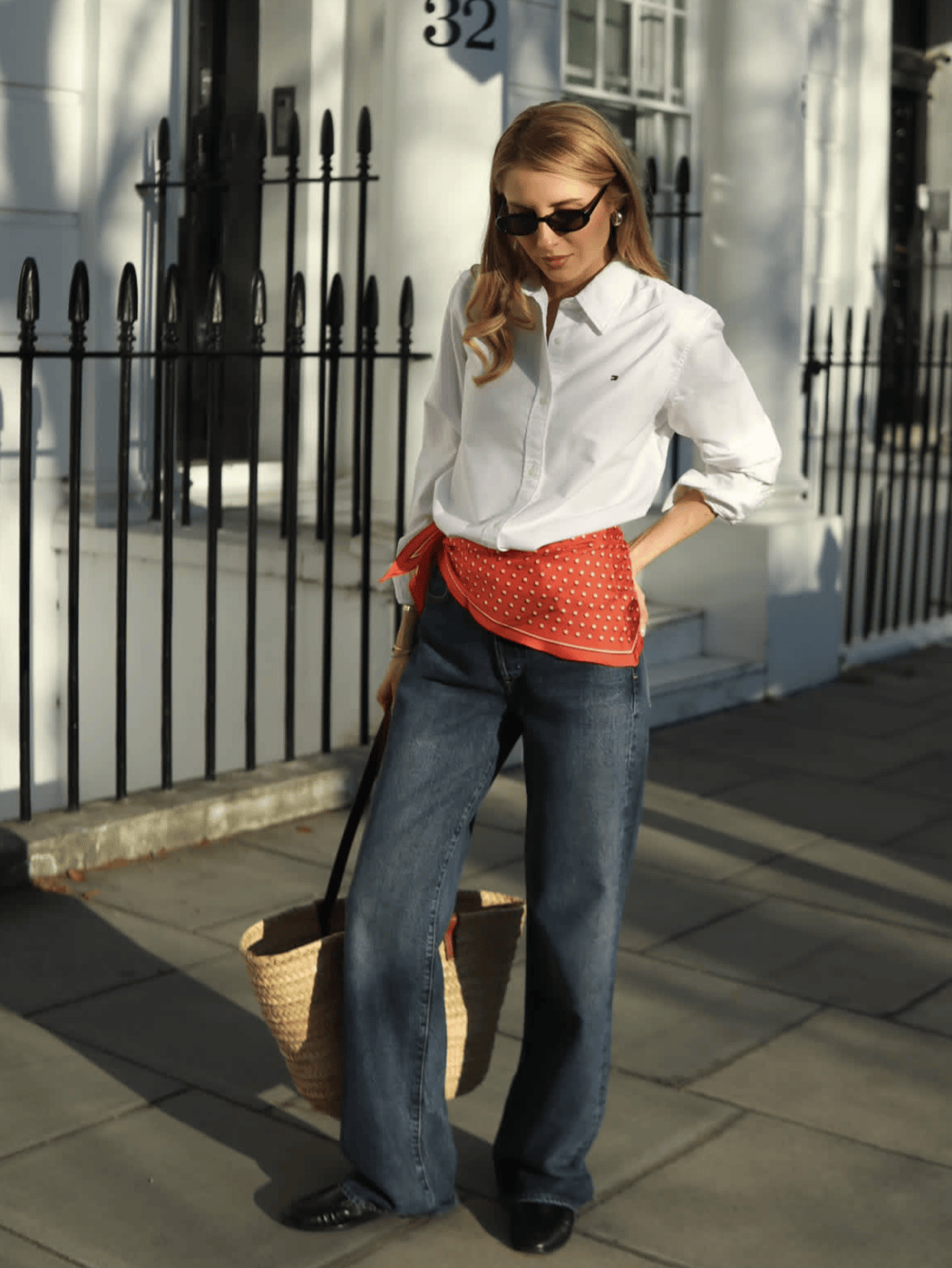 丝巾的花色和裤子同色系,会更像是一条完整的wrap trousers,如果形成对比用撞色或印花丝巾也很出彩。