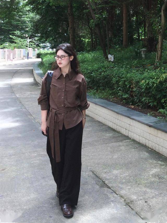 咖色的系带衬衫,腰带一收,比例更完美,黑色阔腿裤垂感十足,藏肉又显腿长。