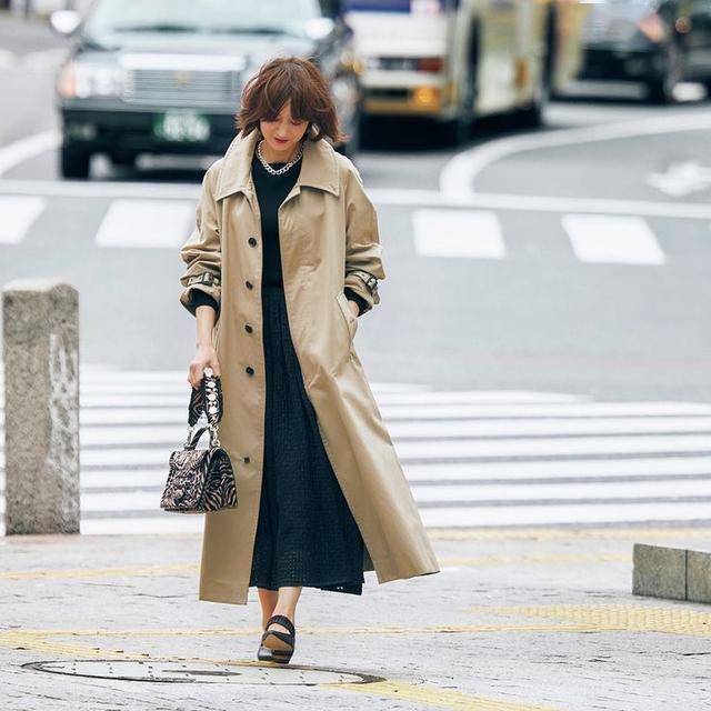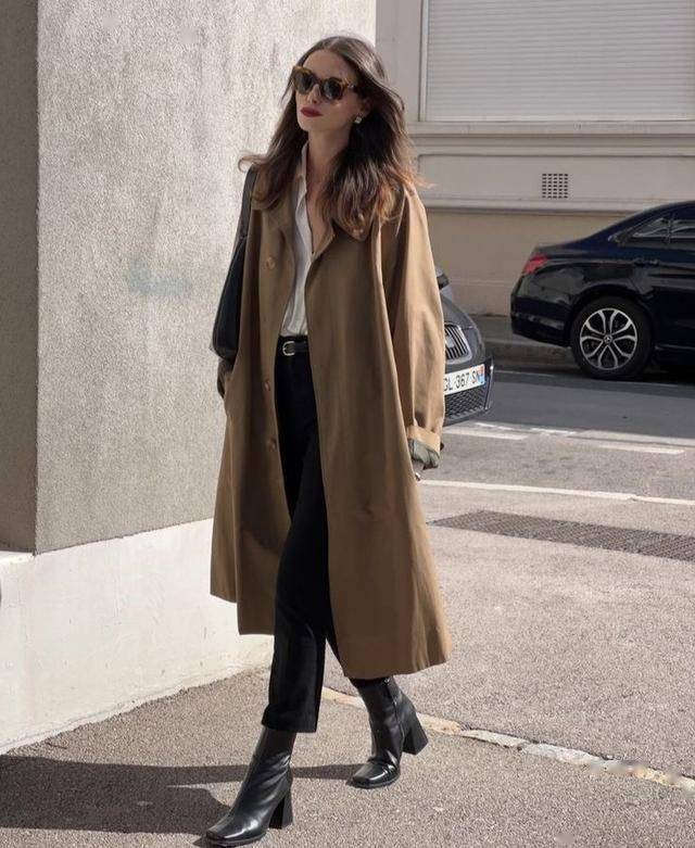 大面积的咖色覆盖在风衣外面,用黑白色丰富层次,清冷且高级,衣领敞开穿,露出锁骨更加迷人。