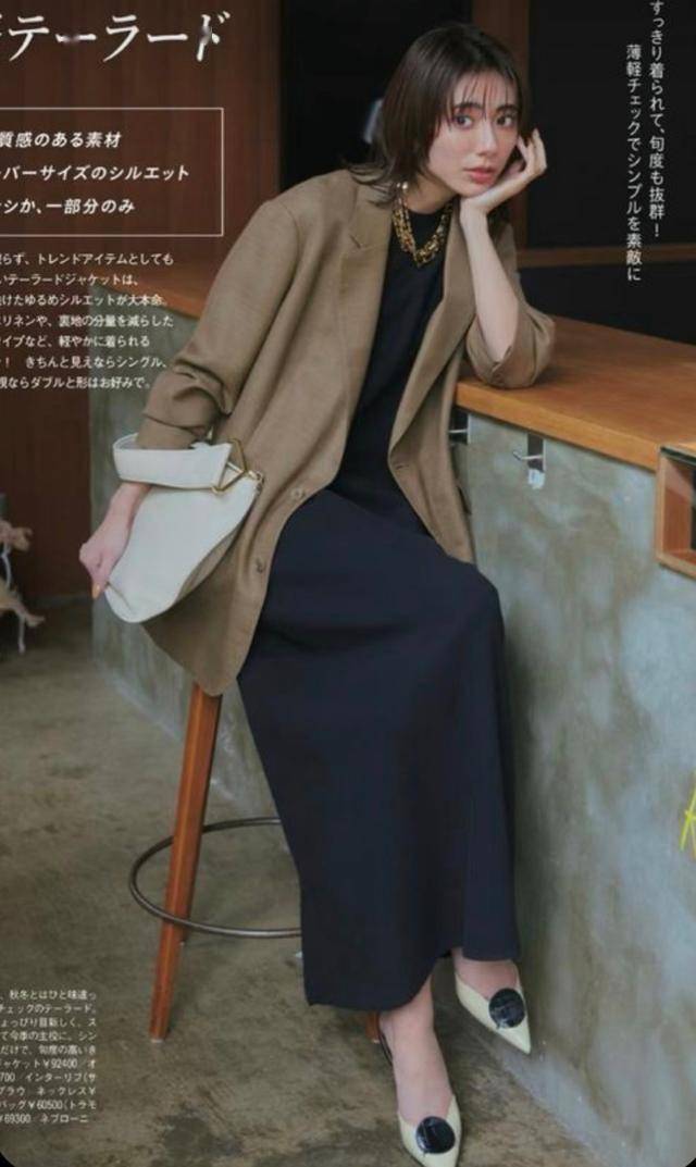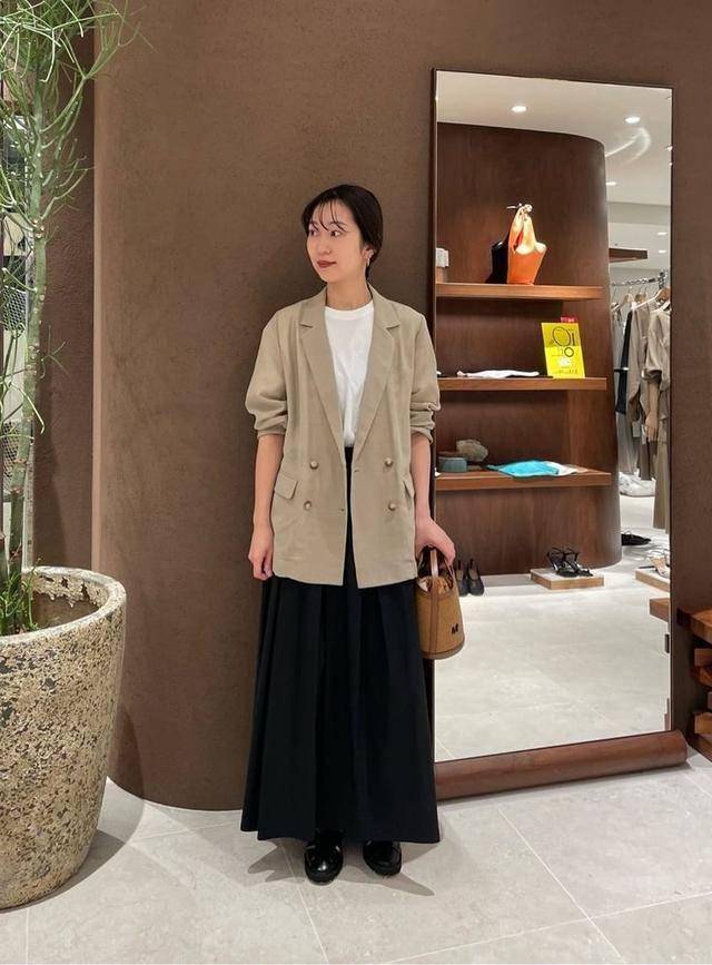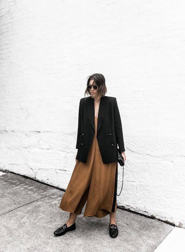 清晰的轮廓线条,出现在西装外套上,叠穿黑色长裙又美又飒。