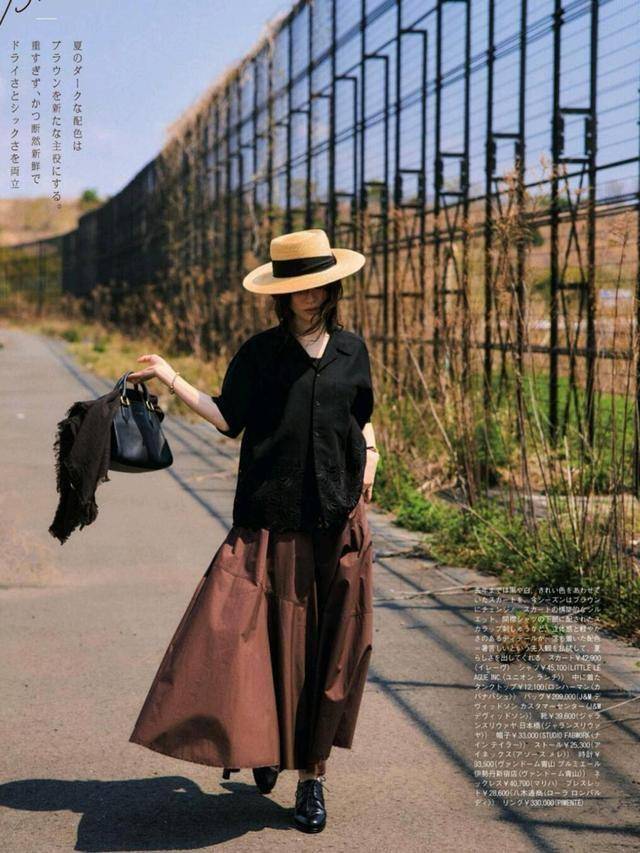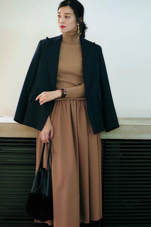 衣橱里那件黑西装,也能被咖色伞裙拯救。