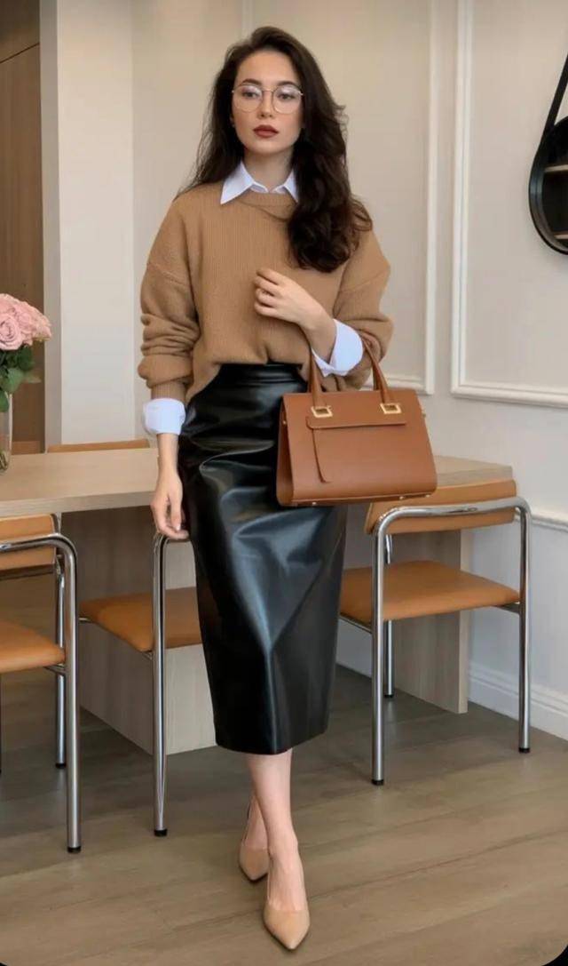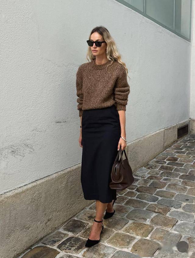 永不出错的咖色套头毛衣,还是配裙子更好看,黑色的包臀半身裙,显瘦又有女人味,鞋子与其顺色更显高。