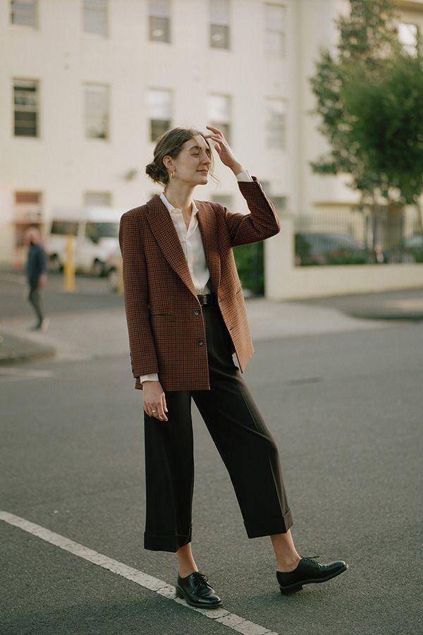 极简设计的咖色西装阔腿裤,撑起了基础款的气场,配双薄底鞋,让你脚下生风。