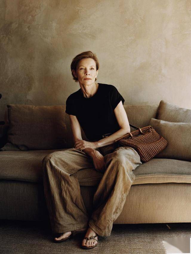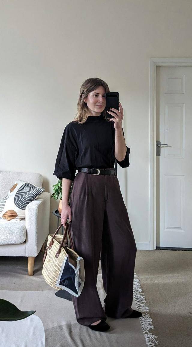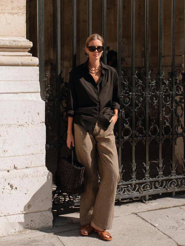 黑色的纯棉T恤配咖色亚麻阔腿裤,就非常符合春日的穿衣需求。