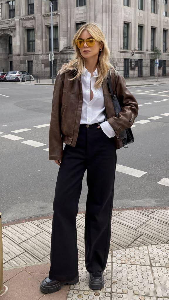 咖色皮夹克,穿在身上好有气场,复古中透露着一丝酷感,白衬衫和黑西裤,又能注入正式氛围,日常通勤无缝切换。