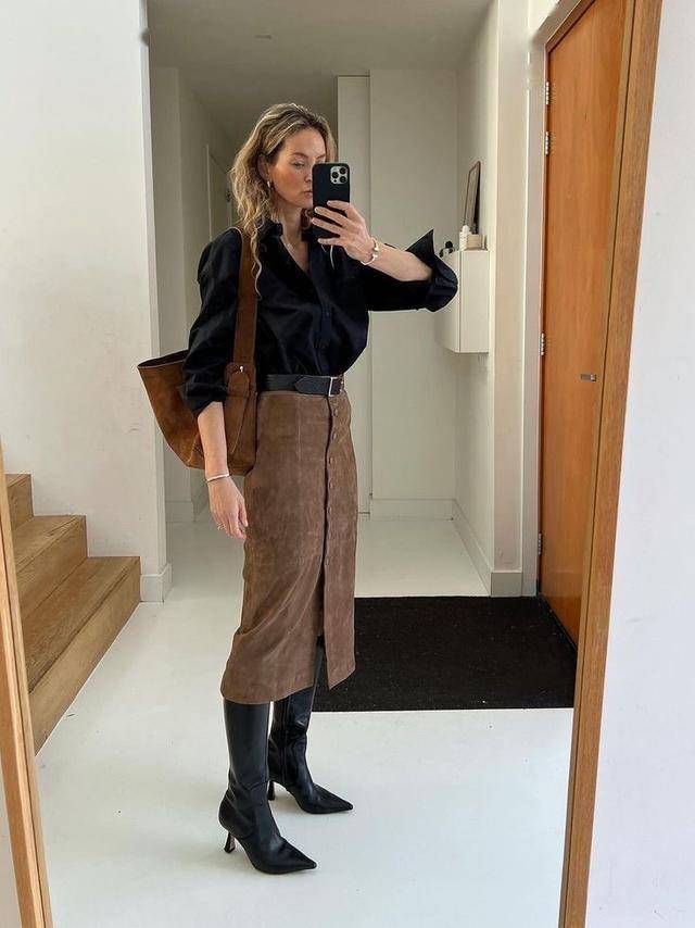 只需要一条咖色麂皮半裙,便可以美的毫不费力。
