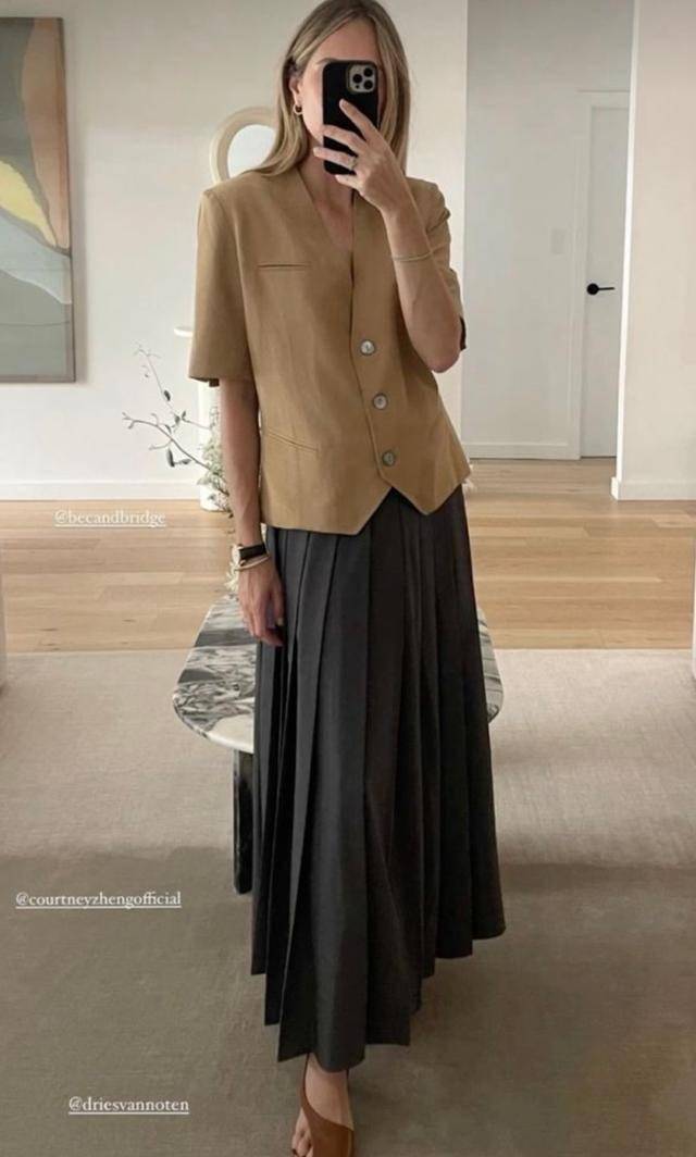 短袖西装配百褶裙,线条感垂直而下,纵向拉长身形比例。