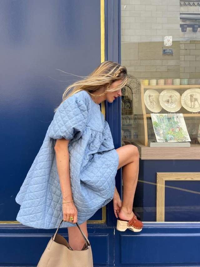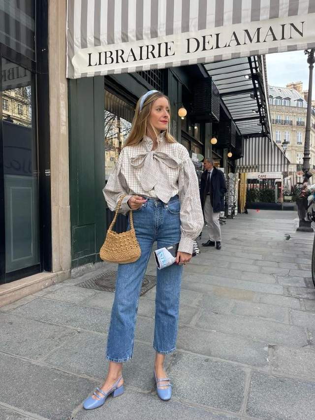 她的法式穿搭,是色彩的温柔碰撞,也是复古与现代的完美平衡。在她的造型里,你能看到浅棕色廓形西装搭配浅蓝色内搭与牛仔阔腿裤,用蓝色玛丽珍鞋呼应内搭色调,再以丝巾、发圈点缀细节,打造出温柔又随性的日常感;也能看到藏青色针织开衫搭配牛仔裤,用黑色凉鞋增添慵懒,或是浅蓝色绗缝外套搭配娃娃裙,用木质厚底鞋解锁复古俏皮,每一套都跳脱了法式穿搭的固有框架,却又精准拿捏了法式浪漫的核心。她从不局限于单一风格,而是将复古、休闲、精致揉进日常,用色彩串联起不同氛围,让法式时髦变得更加多元且接地气。