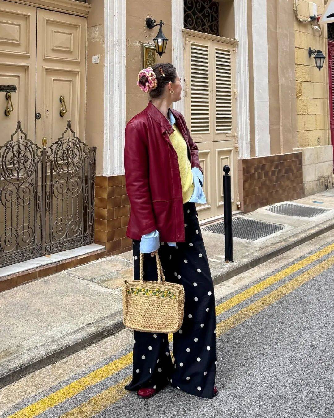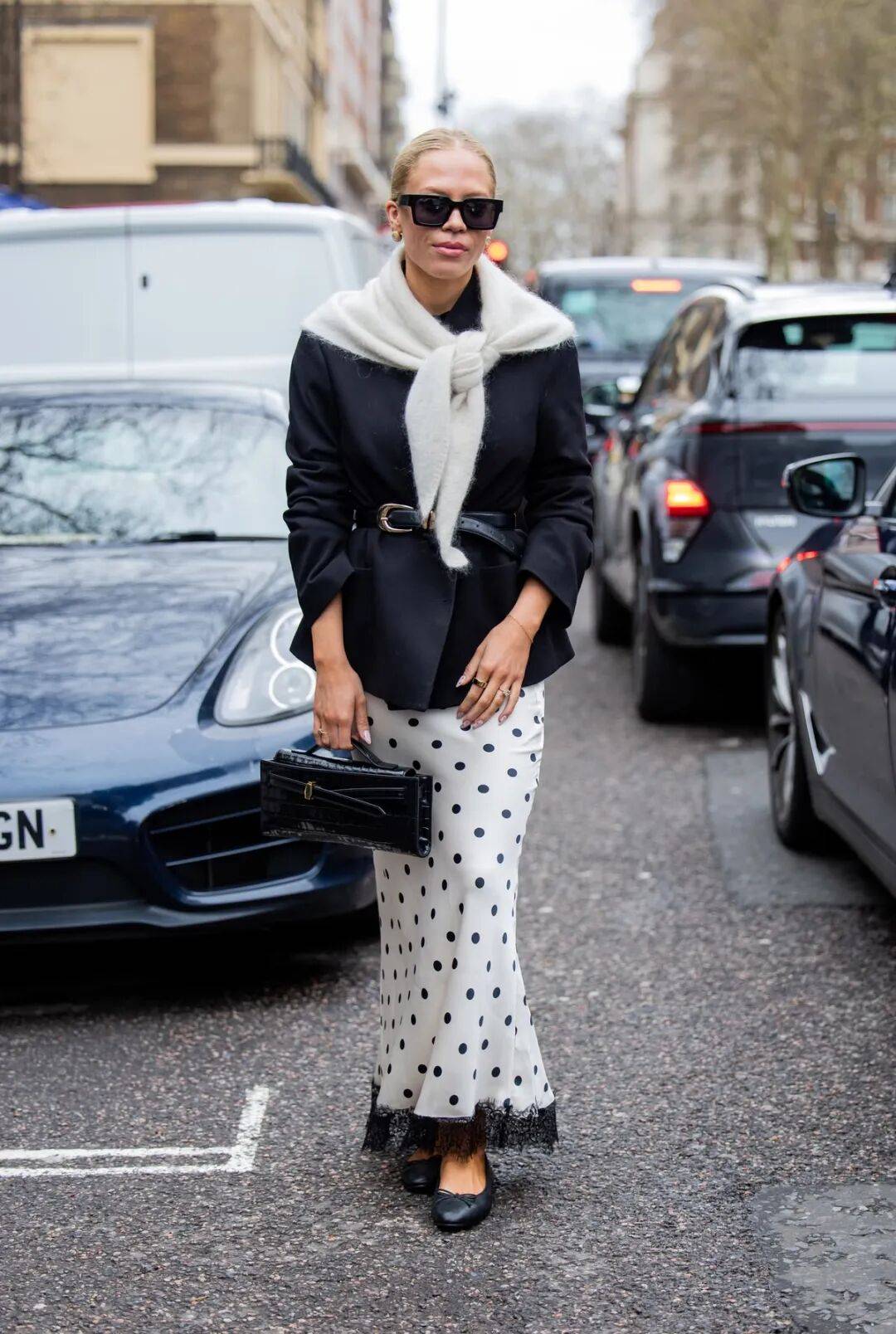 还有时下流行系在腰间的穿法,也很适合用一条波点丝巾来增加层次。